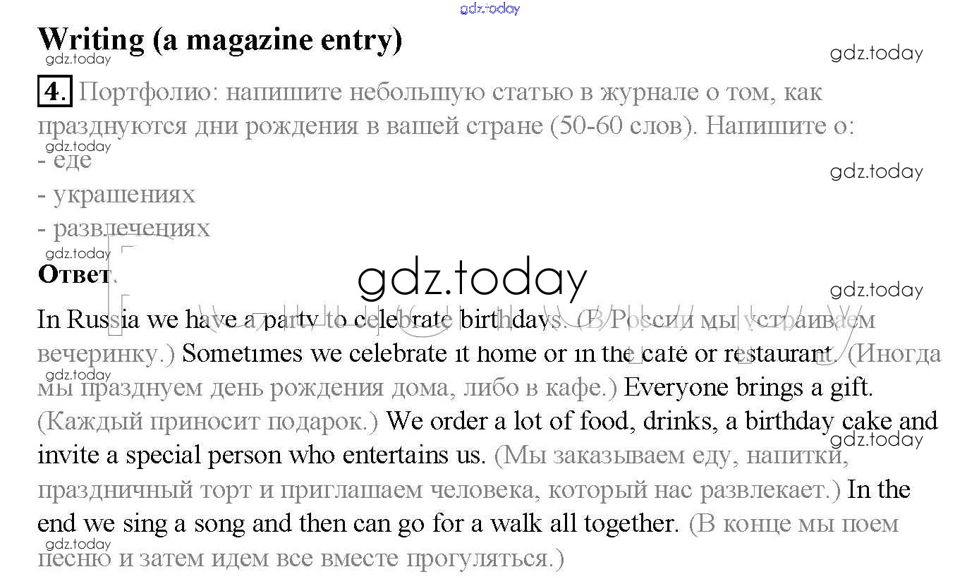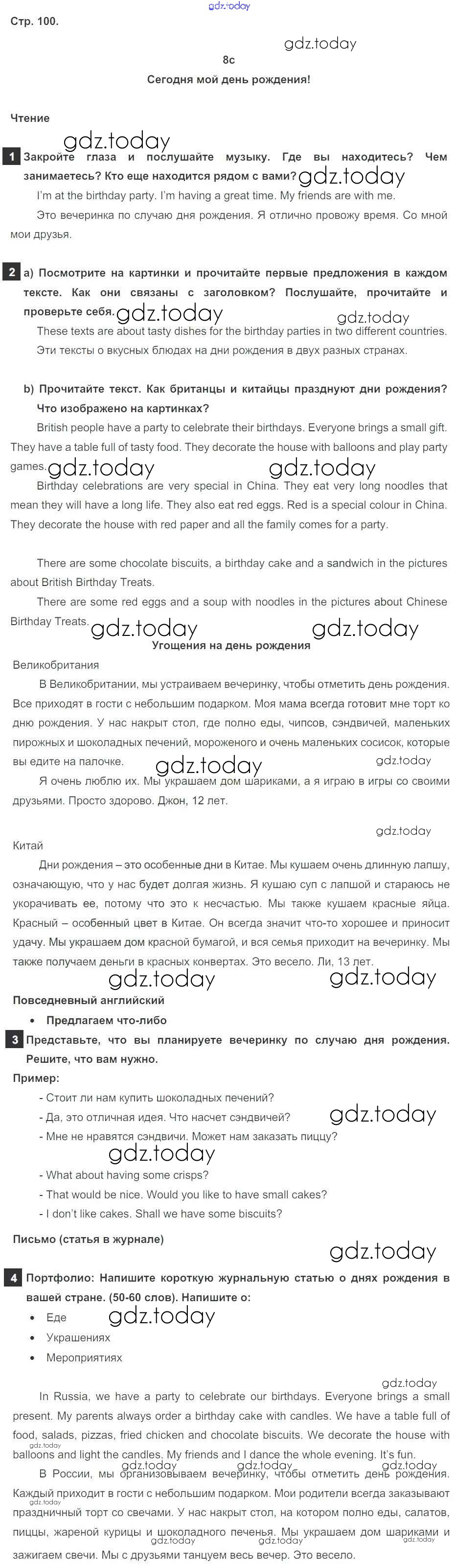 На страницах сайта gdz.today вы найдете учебный и вспомогательный материал, направленный на улучшения знаний школьной программы. ГДЗ - онлайн мир знаний Решение к Module 8. Special days стр. 100 Учебнику по Английскому языку для 5 класса Ваулина, Дули Просвещение Spotlight 2015