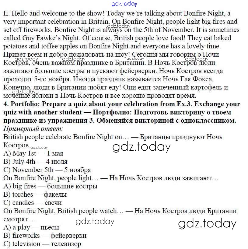 На страницах сайта gdz.today вы найдете учебный и вспомогательный материал, направленный на улучшения знаний школьной программы. ГДЗ - онлайн мир знаний Решение к Module 8. Special days стр. 101 Учебнику по Английскому языку для 5 класса Ваулина, Дули Просвещение Spotlight 2015