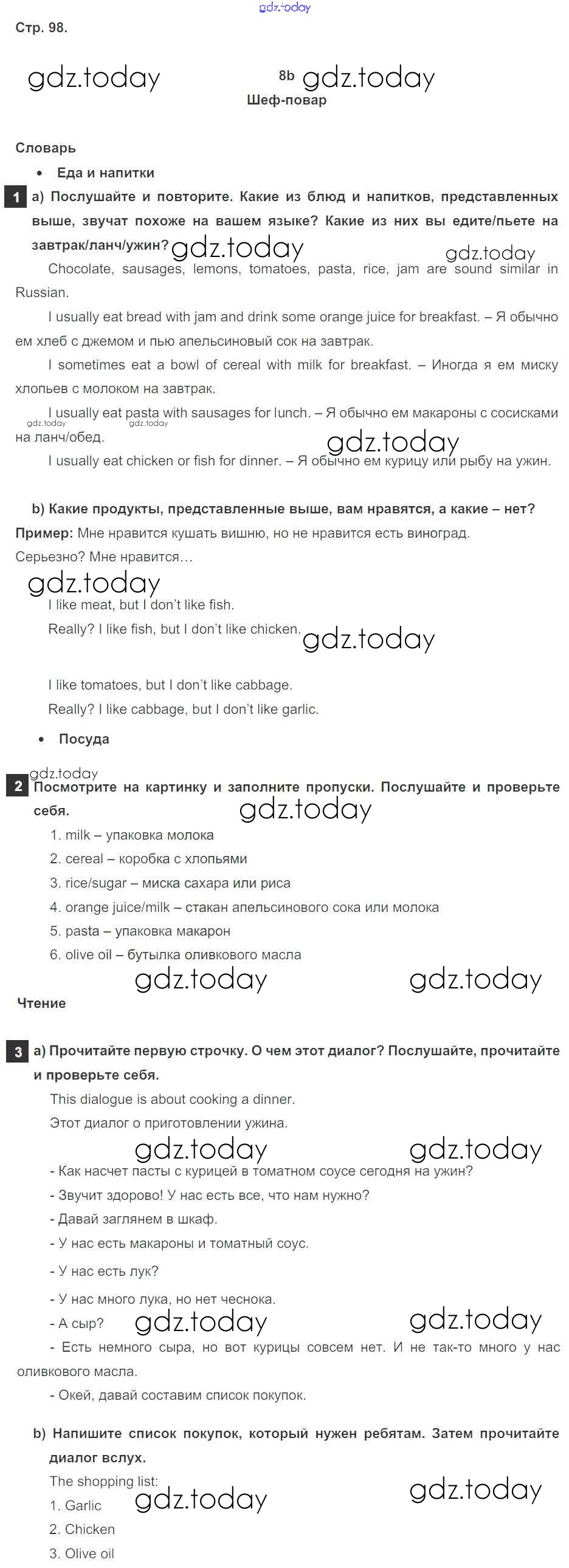 На страницах сайта gdz.today вы найдете учебный и вспомогательный материал, направленный на улучшения знаний школьной программы. ГДЗ - онлайн мир знаний Решение к Module 8. Special days стр. 98 Учебнику по Английскому языку для 5 класса Ваулина, Дули Просвещение Spotlight 2015