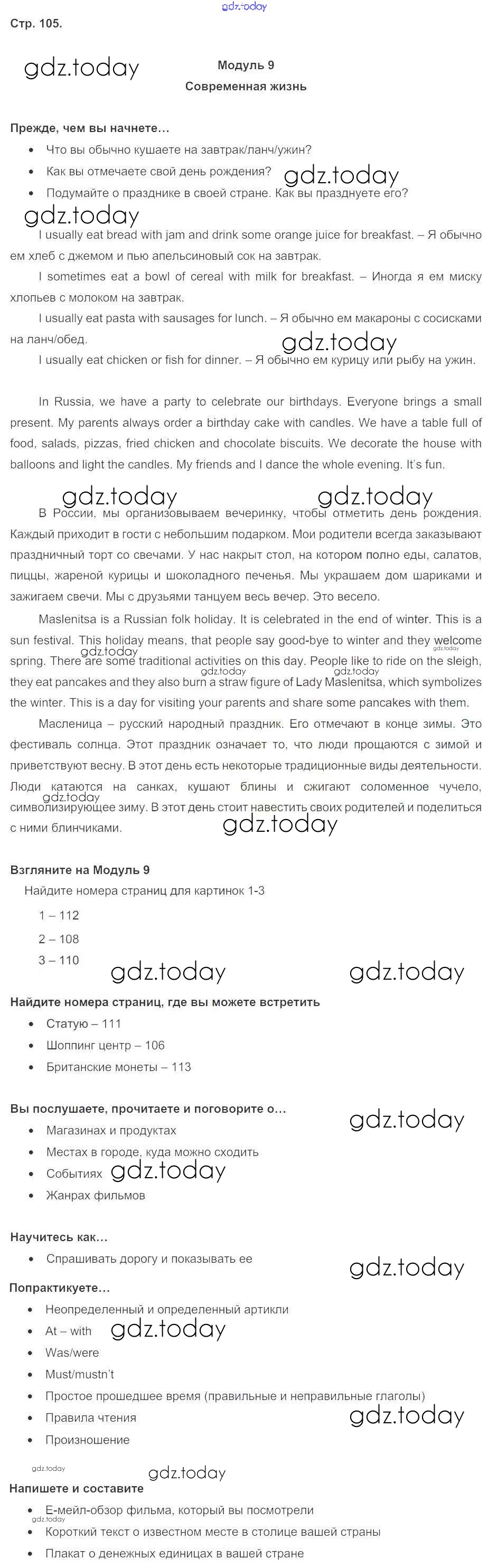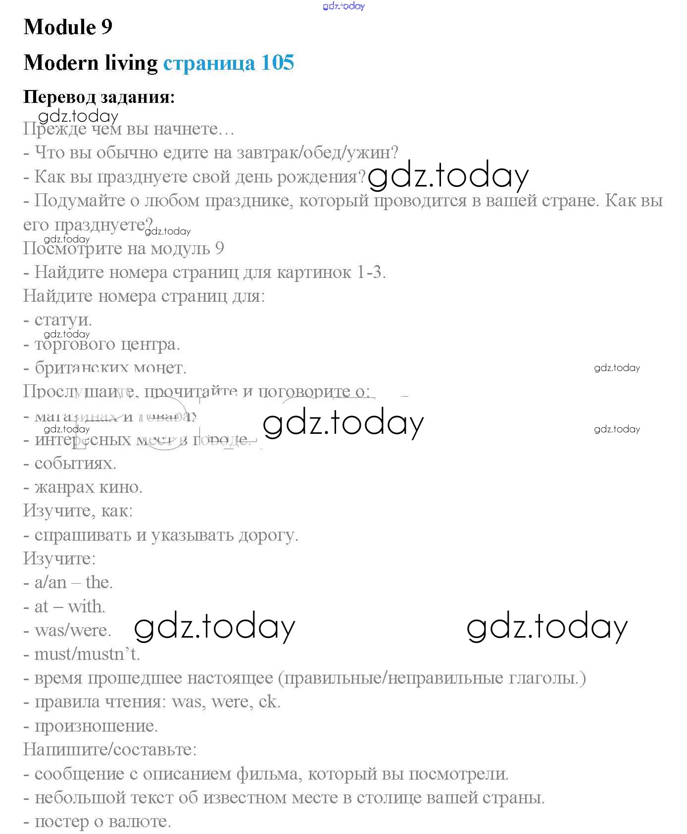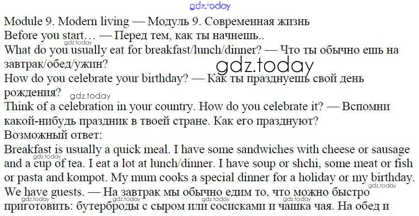 На страницах сайта gdz.today вы найдете учебный и вспомогательный материал, направленный на улучшения знаний школьной программы. ГДЗ - онлайн мир знаний Решение к Module 9. Modern living стр. 105 Учебнику по Английскому языку для 5 класса Ваулина, Дули Просвещение Spotlight 2015