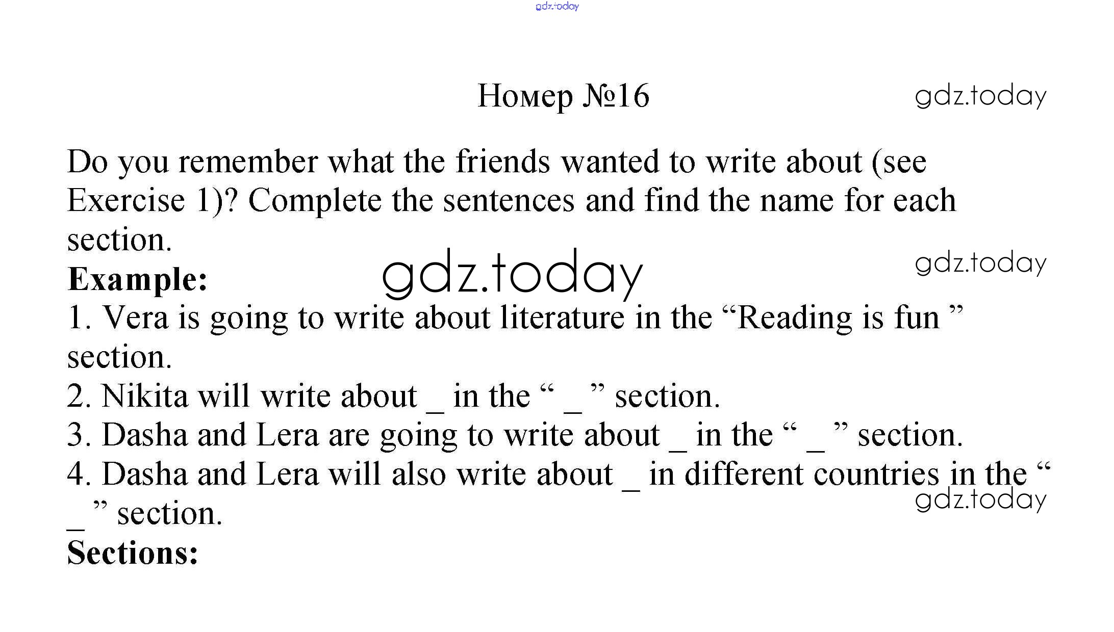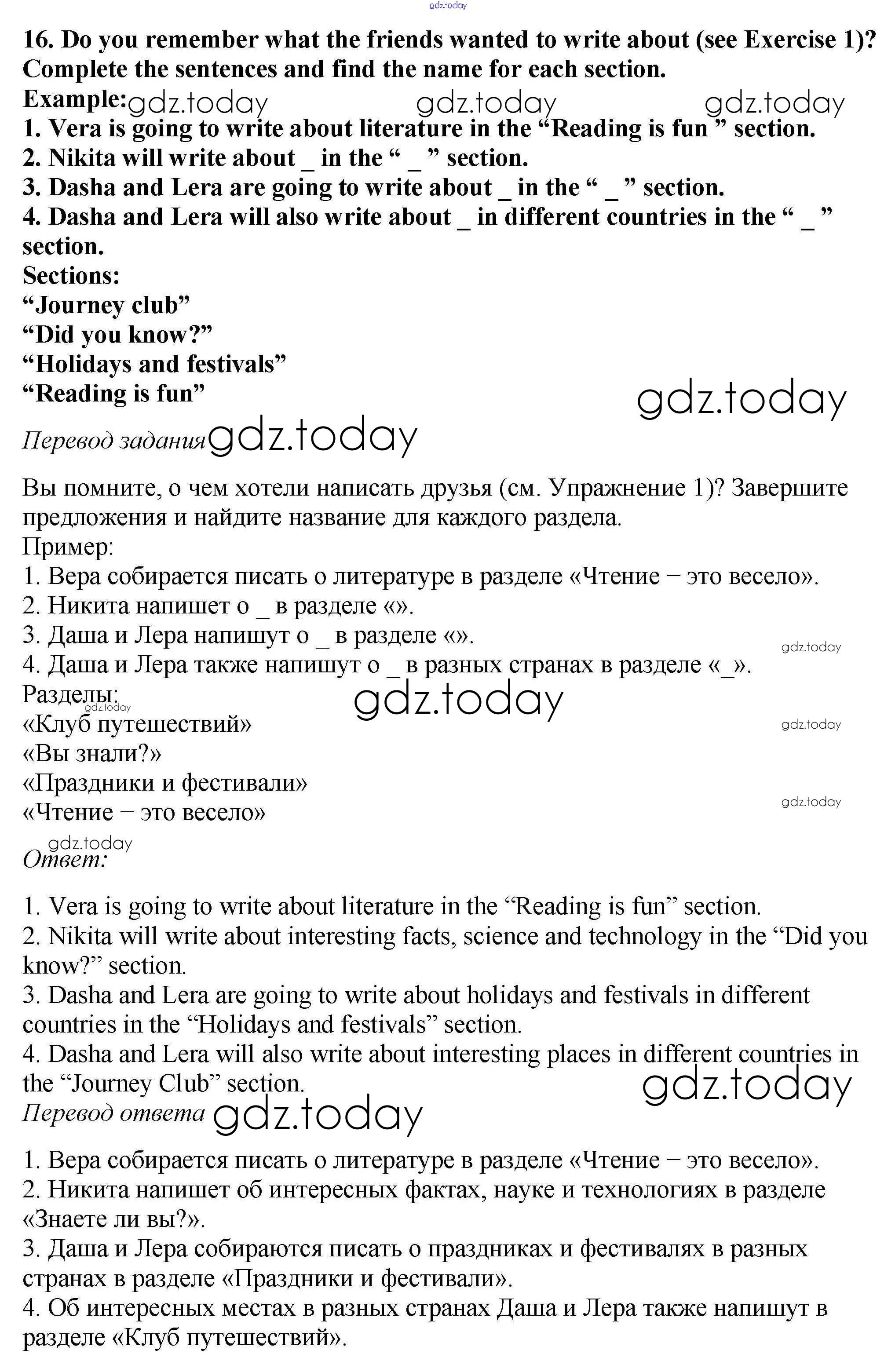 На страницах сайта gdz.today вы найдете учебный и вспомогательный материал, направленный на улучшения знаний школьной программы. ГДЗ - онлайн мир знаний Решение к Unit 1. Let’s make a magazine 16 Учебнику по Английскому языку для 5 класса Вербицкая, Эббс Вентана-граф Forward 2016