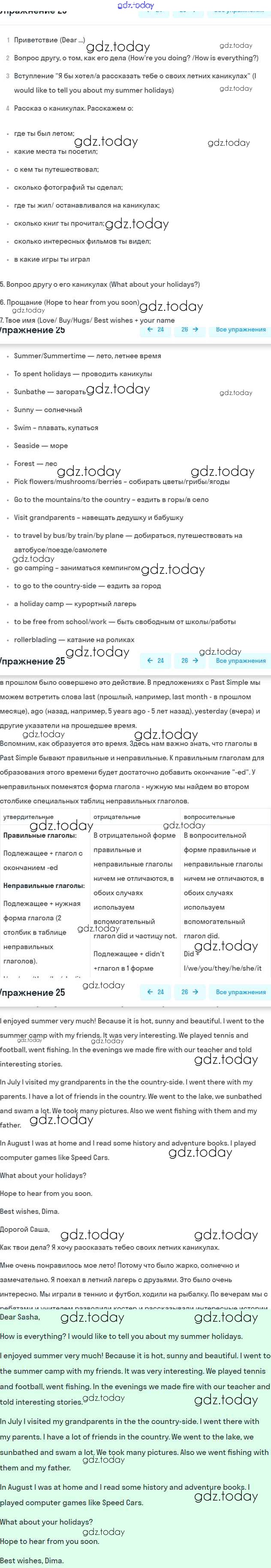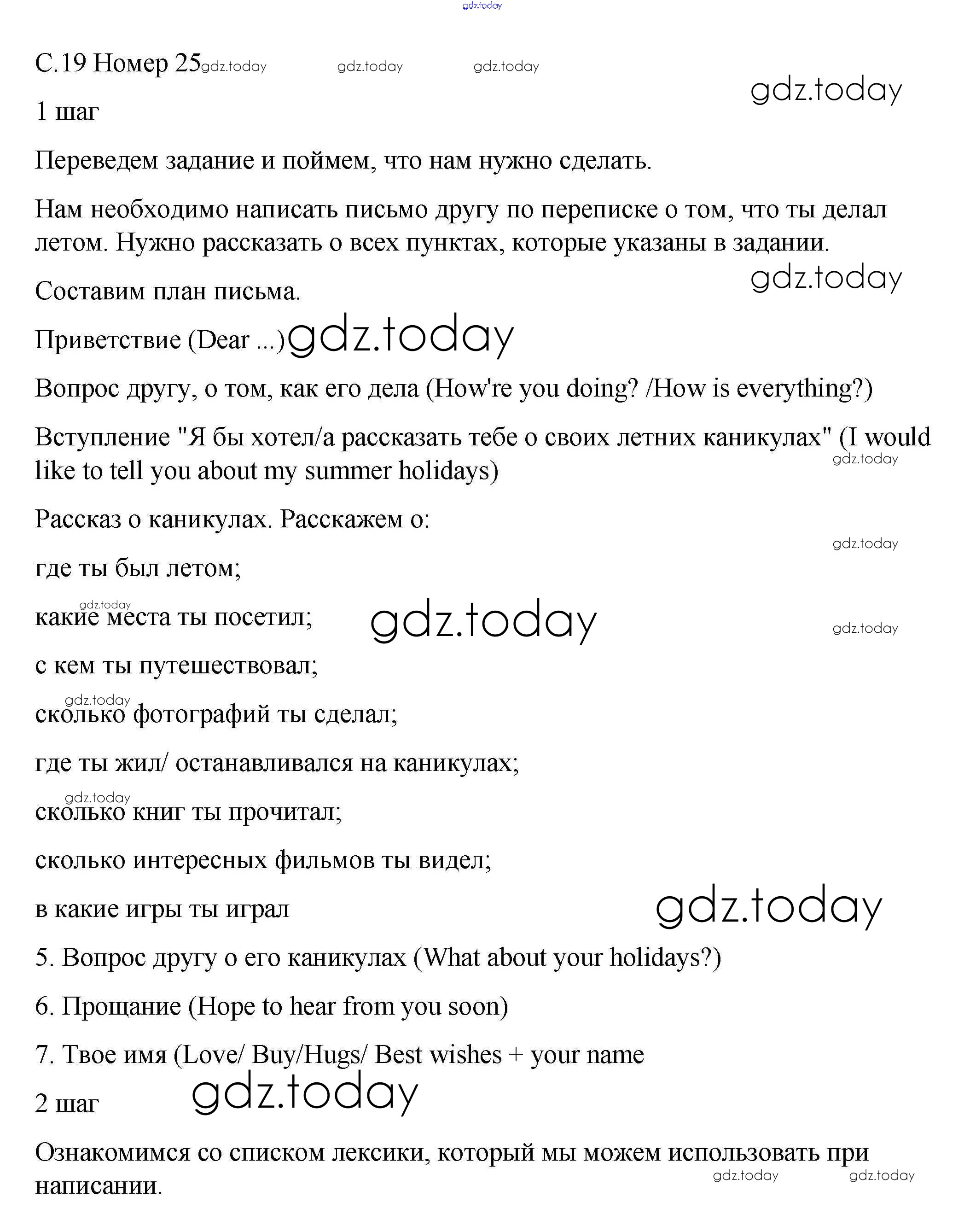 На страницах сайта gdz.today вы найдете учебный и вспомогательный материал, направленный на улучшения знаний школьной программы. ГДЗ - онлайн мир знаний Решение к Unit 1. Holidays Are Over 25 Рабочей тетради по Английскому языку для 5 класса Афанасьева, Михеева Дрофа Rainbow 2017
