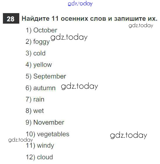 На страницах сайта gdz.today вы найдете учебный и вспомогательный материал, направленный на улучшения знаний школьной программы. ГДЗ - онлайн мир знаний Решение к Unit 1. Holidays Are Over 28 Рабочей тетради по Английскому языку для 5 класса Афанасьева, Михеева Дрофа Rainbow 2017
