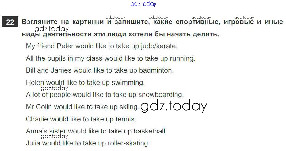 На страницах сайта gdz.today вы найдете учебный и вспомогательный материал, направленный на улучшения знаний школьной программы. ГДЗ - онлайн мир знаний Решение к Unit 3. Healthy Ways 22 Рабочей тетради по Английскому языку для 5 класса Афанасьева, Михеева Дрофа Rainbow 2017
