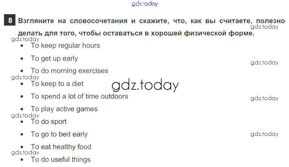 На страницах сайта gdz.today вы найдете учебный и вспомогательный материал, направленный на улучшения знаний школьной программы. ГДЗ - онлайн мир знаний Решение к Unit 3. Healthy Ways 8 Рабочей тетради по Английскому языку для 5 класса Афанасьева, Михеева Дрофа Rainbow 2017