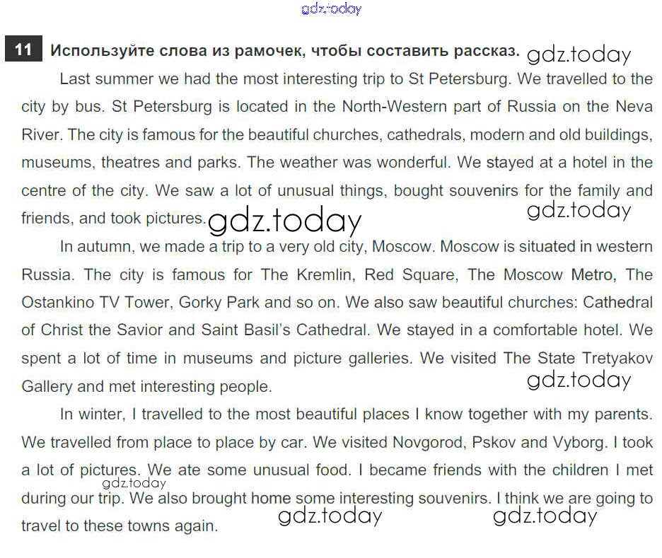 На страницах сайта gdz.today вы найдете учебный и вспомогательный материал, направленный на улучшения знаний школьной программы. ГДЗ - онлайн мир знаний Решение к Unit 5. From Place to Place 11 Рабочей тетради по Английскому языку для 5 класса Афанасьева, Михеева Дрофа Rainbow 2017