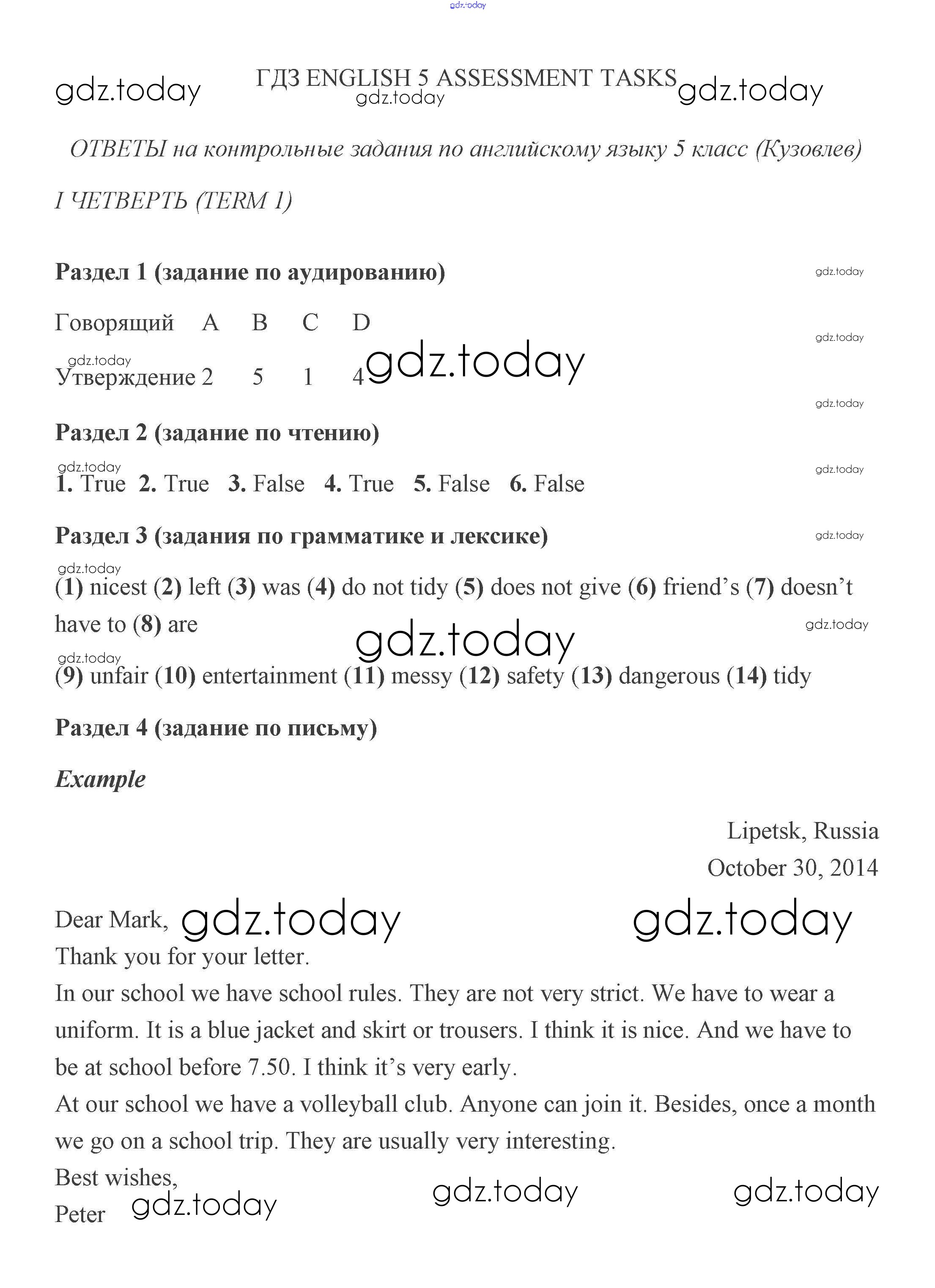 На страницах сайта gdz.today вы найдете учебный и вспомогательный материал, направленный на улучшения знаний школьной программы. ГДЗ - онлайн мир знаний Решение к Terms 1 Контрольным заданиям по Английскому языку для 5 класса Кузовлев, Симкин Просвещение 2019