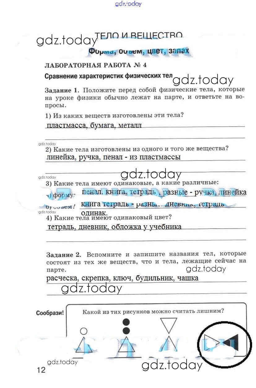На страницах сайта gdz.today вы найдете учебный и вспомогательный материал, направленный на улучшения знаний школьной программы. ГДЗ - онлайн мир знаний Страницы (решение) 12 Рабочей тетради по Физике для 5 класса Гуревич, Краснов Дрофа 2012