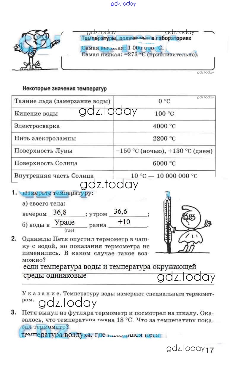 На страницах сайта gdz.today вы найдете учебный и вспомогательный материал, направленный на улучшения знаний школьной программы. ГДЗ - онлайн мир знаний Страницы (решение) 17 Рабочей тетради по Физике для 5 класса Гуревич, Краснов Дрофа 2012