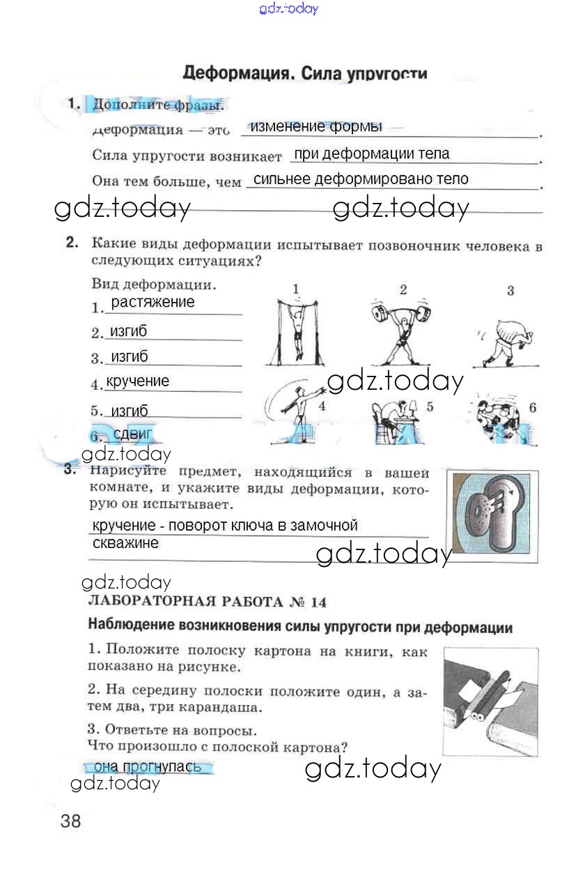 На страницах сайта gdz.today вы найдете учебный и вспомогательный материал, направленный на улучшения знаний школьной программы. ГДЗ - онлайн мир знаний Страницы (решение) 38 Рабочей тетради по Физике для 5 класса Гуревич, Краснов Дрофа 2012
