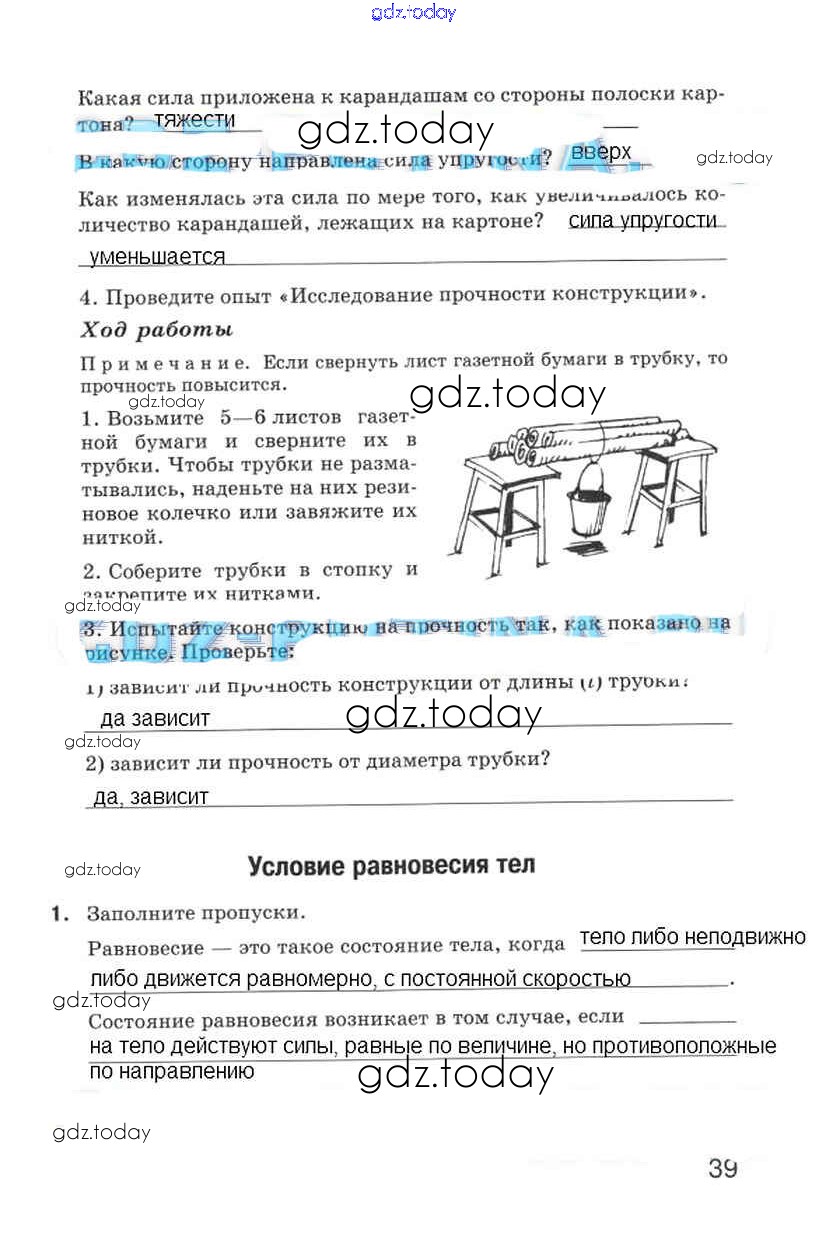 На страницах сайта gdz.today вы найдете учебный и вспомогательный материал, направленный на улучшения знаний школьной программы. ГДЗ - онлайн мир знаний Страницы (решение) 39 Рабочей тетради по Физике для 5 класса Гуревич, Краснов Дрофа 2012