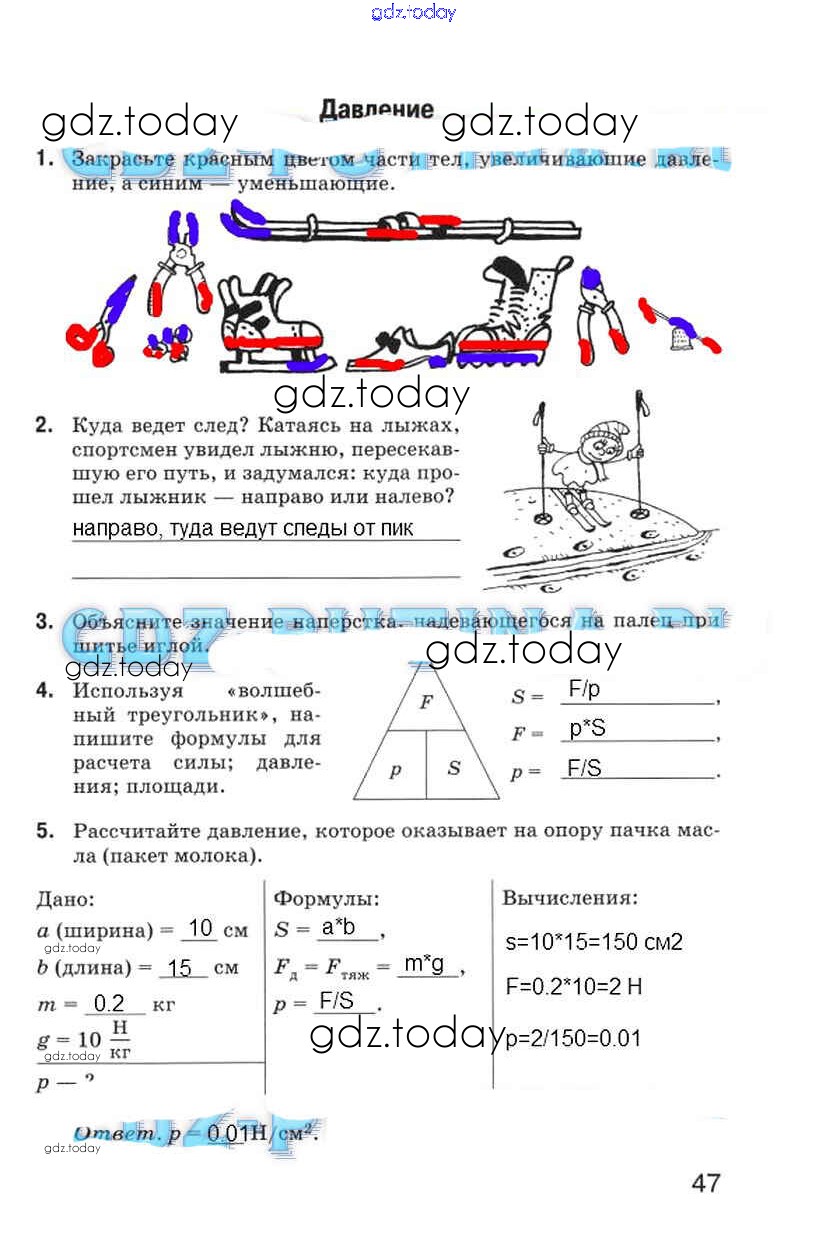 На страницах сайта gdz.today вы найдете учебный и вспомогательный материал, направленный на улучшения знаний школьной программы. ГДЗ - онлайн мир знаний Страницы (решение) 47 Рабочей тетради по Физике для 5 класса Гуревич, Краснов Дрофа 2012