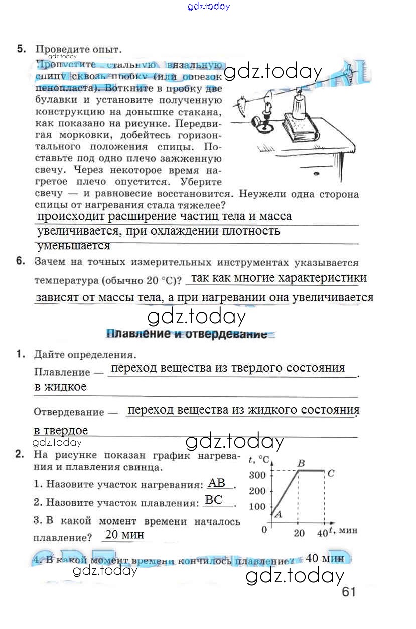 На страницах сайта gdz.today вы найдете учебный и вспомогательный материал, направленный на улучшения знаний школьной программы. ГДЗ - онлайн мир знаний Страницы (решение) 61 Рабочей тетради по Физике для 5 класса Гуревич, Краснов Дрофа 2012