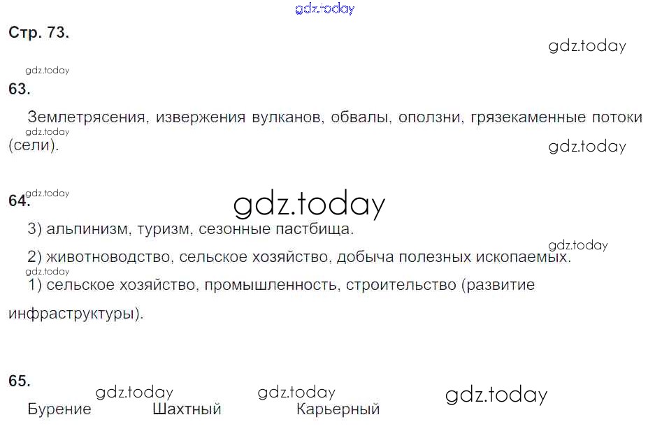 На страницах сайта gdz.today вы найдете учебный и вспомогательный материал, направленный на улучшения знаний школьной программы. ГДЗ - онлайн мир знаний Страницы (решение) 73 Рабочей тетради по Географии для 5 класса Дронов, Савельева Дрофа УМК 2016