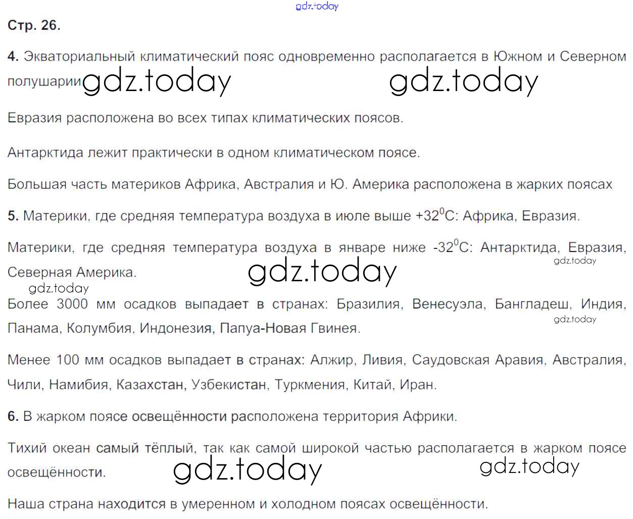 На страницах сайта gdz.today вы найдете учебный и вспомогательный материал, направленный на улучшения знаний школьной программы. ГДЗ - онлайн мир знаний Решение к части 2. Страницы 26 Тетради-тренажеру по Географии для 5-6 класса Лобжанидзе Просвещение Сферы 2014