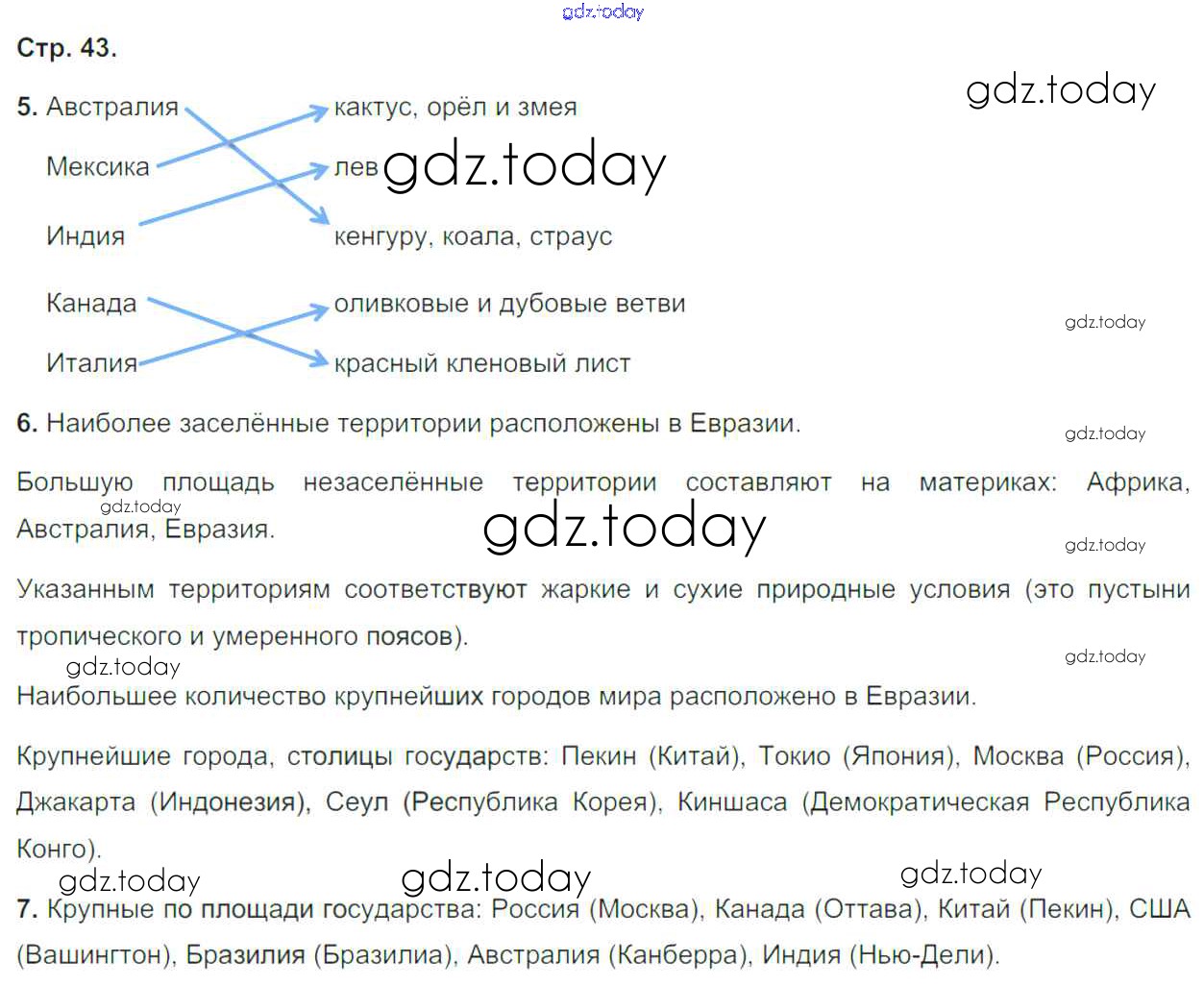 На страницах сайта gdz.today вы найдете учебный и вспомогательный материал, направленный на улучшения знаний школьной программы. ГДЗ - онлайн мир знаний Решение к части 2. Страницы 43 Тетради-тренажеру по Географии для 5-6 класса Лобжанидзе Просвещение Сферы 2014