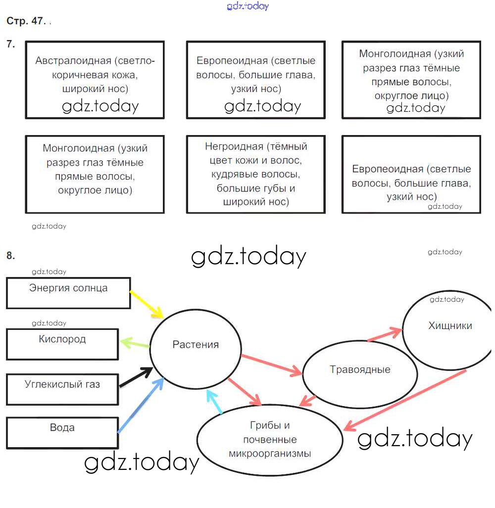 На страницах сайта gdz.today вы найдете учебный и вспомогательный материал, направленный на улучшения знаний школьной программы. ГДЗ - онлайн мир знаний Решение к части 2. Страницы 47 Тетради-тренажеру по Географии для 5-6 класса Лобжанидзе Просвещение Сферы 2014
