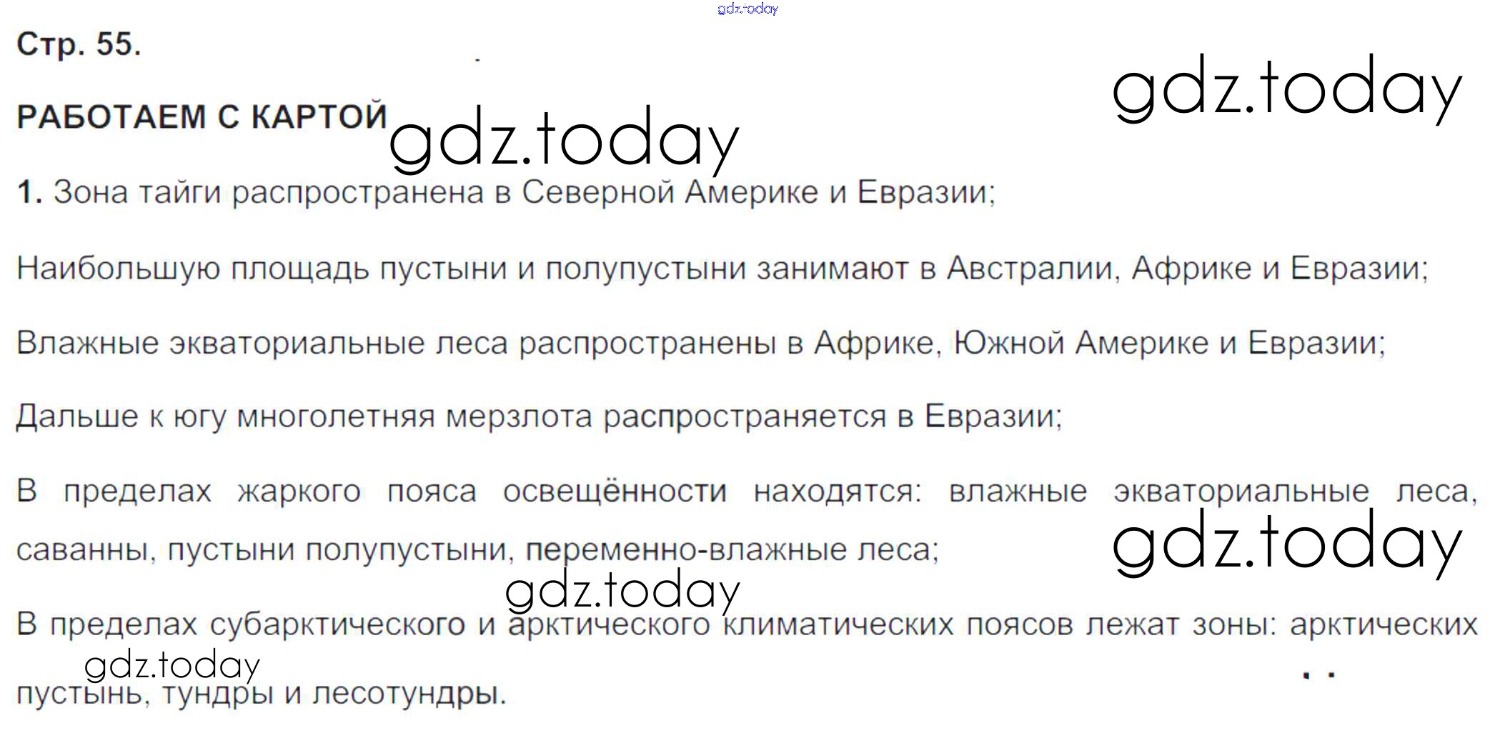 На страницах сайта gdz.today вы найдете учебный и вспомогательный материал, направленный на улучшения знаний школьной программы. ГДЗ - онлайн мир знаний Решение к части 2. Страницы 55 Тетради-тренажеру по Географии для 5-6 класса Лобжанидзе Просвещение Сферы 2014
