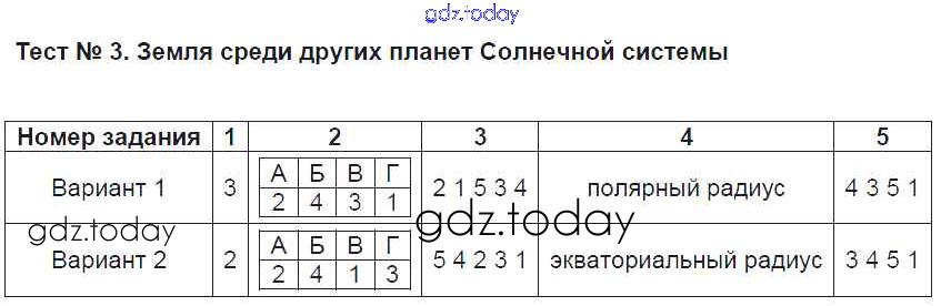 На страницах сайта gdz.today вы найдете учебный и вспомогательный материал, направленный на улучшения знаний школьной программы. ГДЗ - онлайн мир знаний Земля как планета солнечной системы Тест 3 Тестам по Географии для 5 класса Пятунин, Пятунина Экзамен УМК 2017