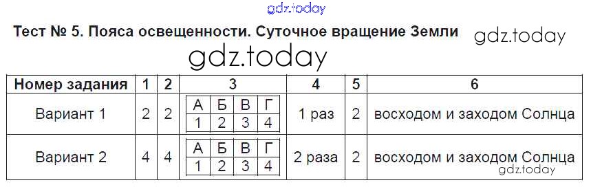 На страницах сайта gdz.today вы найдете учебный и вспомогательный материал, направленный на улучшения знаний школьной программы. ГДЗ - онлайн мир знаний Земля как планета солнечной системы Тест 5 Тестам по Географии для 5 класса Пятунин, Пятунина Экзамен УМК 2017
