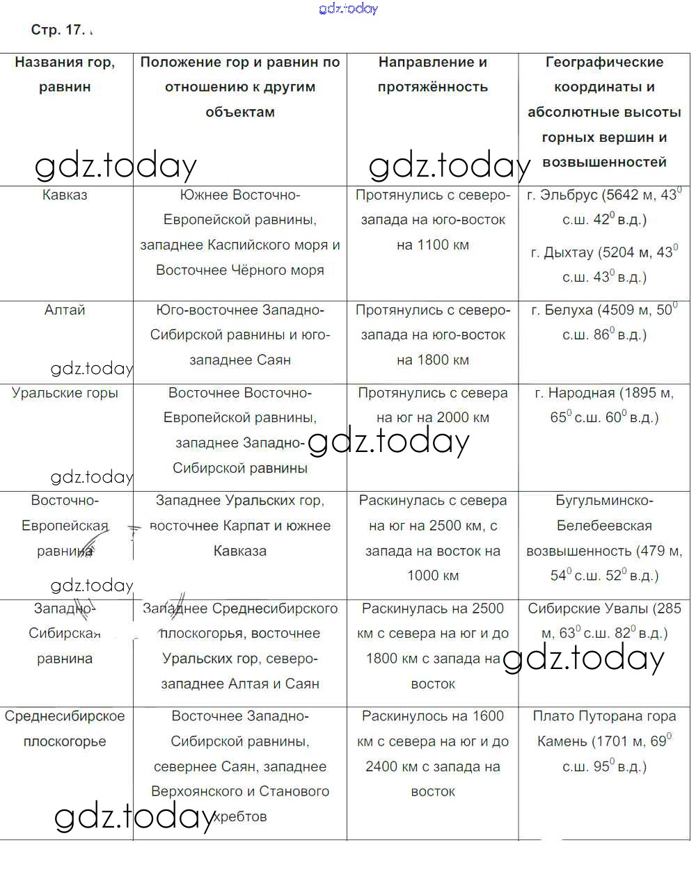 На страницах сайта gdz.today вы найдете учебный и вспомогательный материал, направленный на улучшения знаний школьной программы. ГДЗ - онлайн мир знаний Страницы (решение) 17 Рабочей тетради по Географии для 5-6 класса Сиротин Дрофа 2019