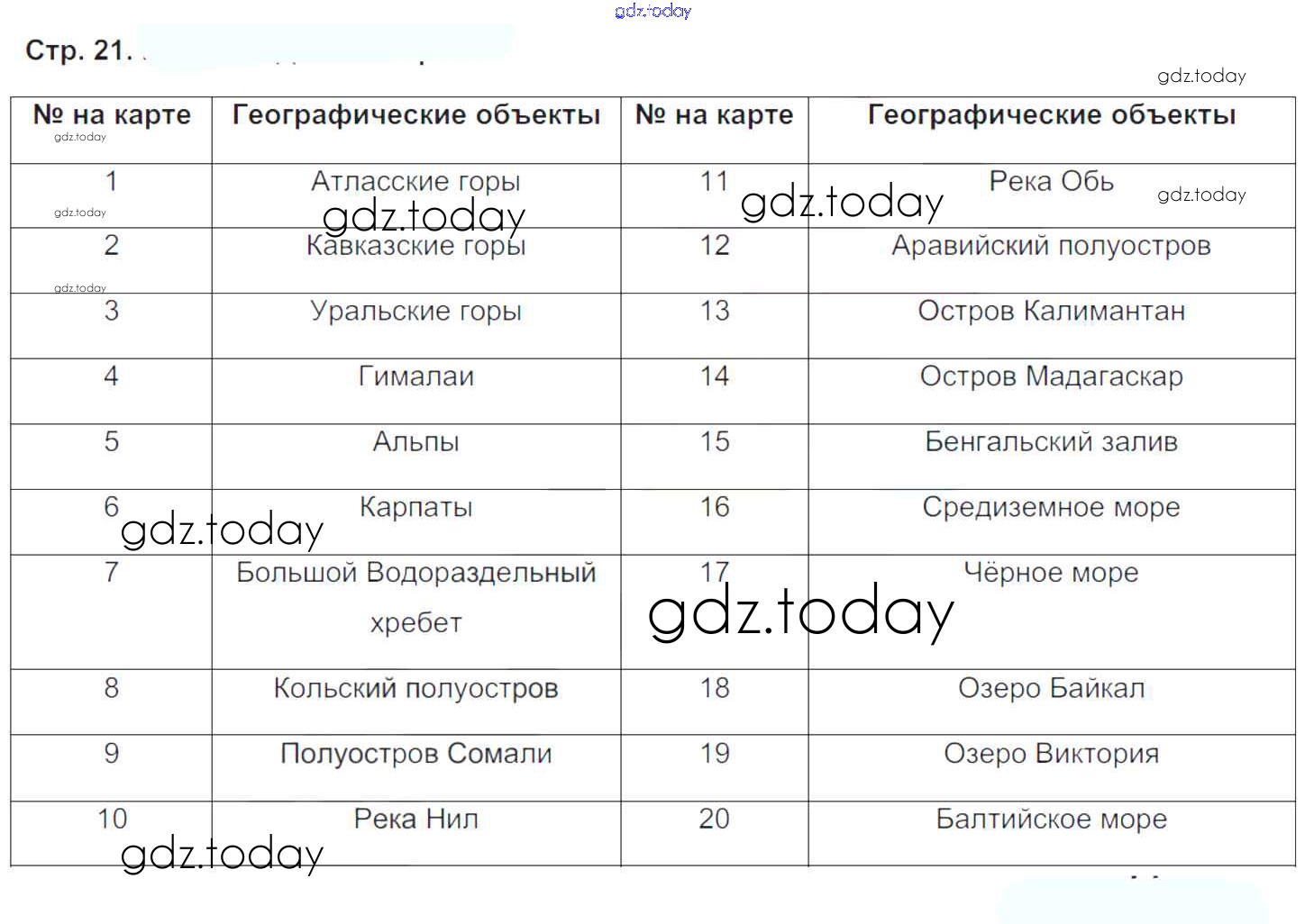 На страницах сайта gdz.today вы найдете учебный и вспомогательный материал, направленный на улучшения знаний школьной программы. ГДЗ - онлайн мир знаний Страницы (решение) 21 Рабочей тетради по Географии для 5-6 класса Сиротин Дрофа 2019
