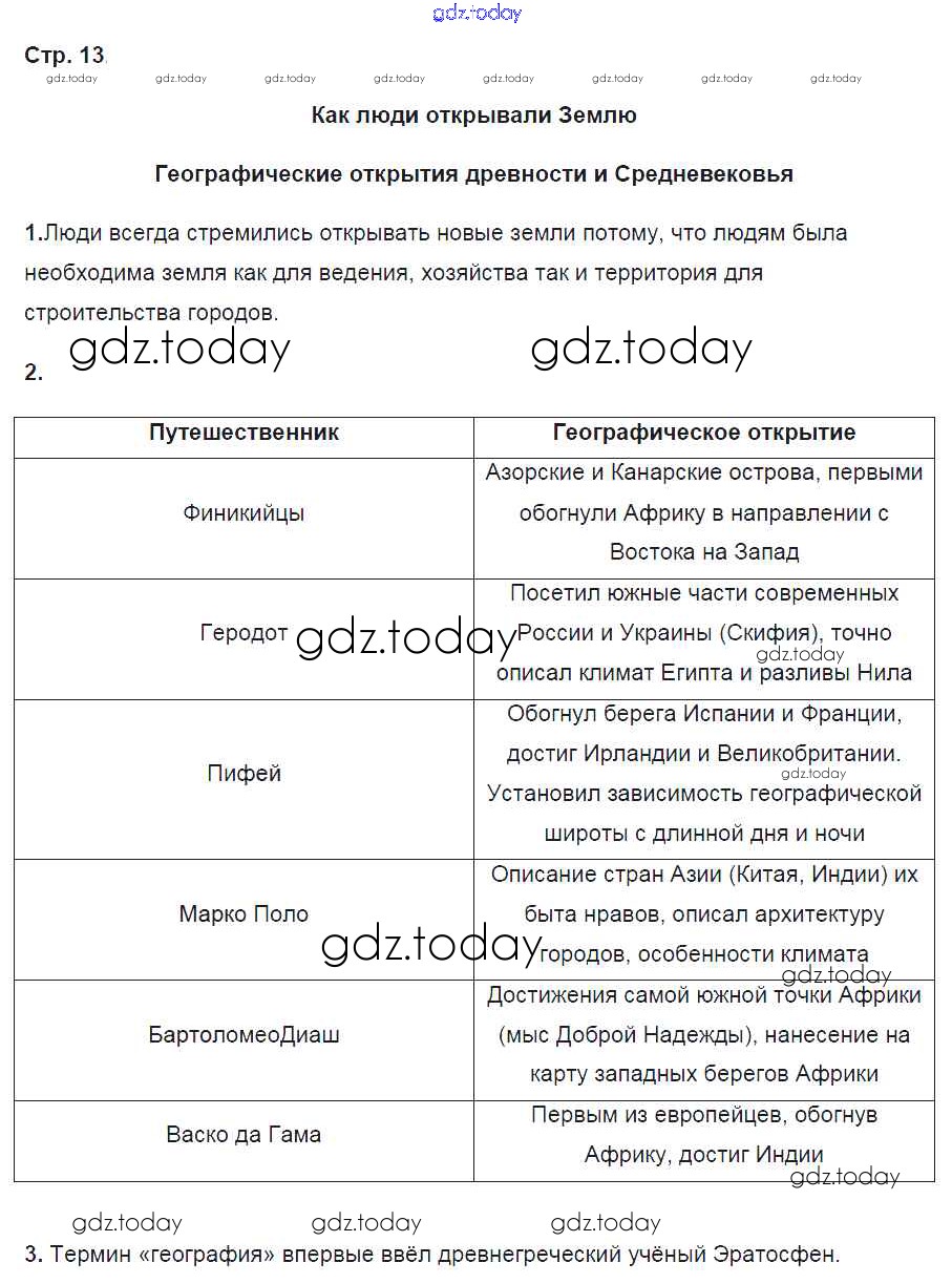На страницах сайта gdz.today вы найдете учебный и вспомогательный материал, направленный на улучшения знаний школьной программы. ГДЗ - онлайн мир знаний Страницы (решение) 13 Рабочей тетради по Географии для 5 класса Сонин, Курчина Дрофа УМК 2015
