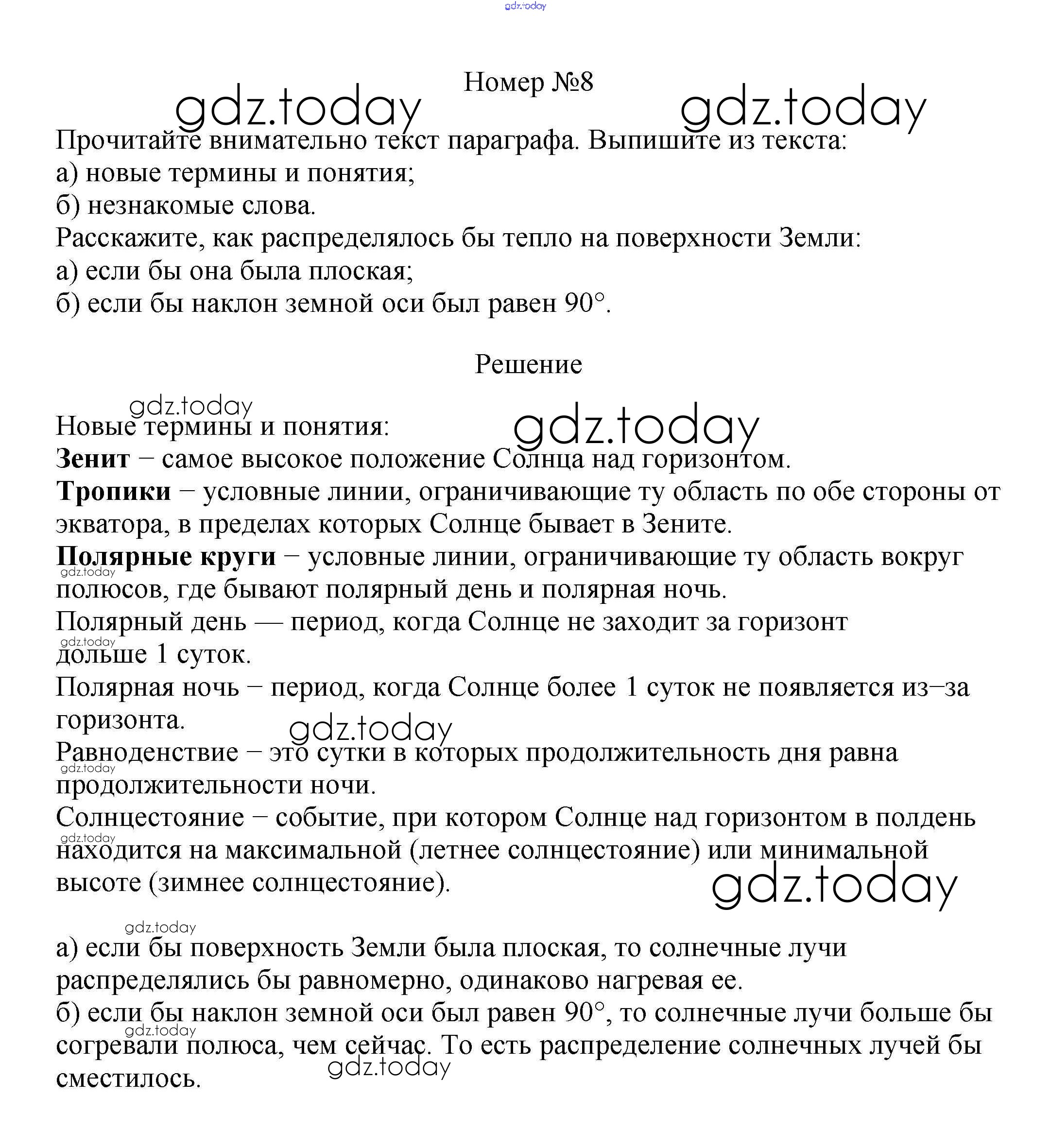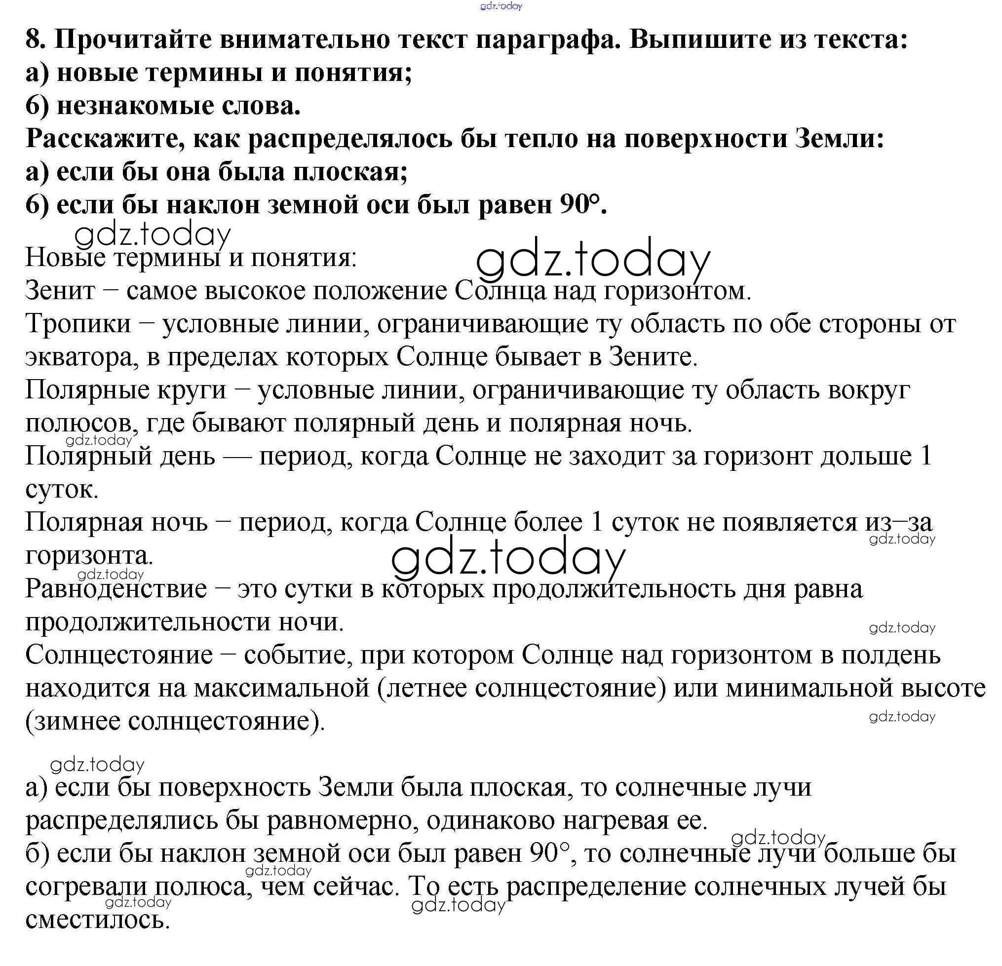 На страницах сайта gdz.today вы найдете учебный и вспомогательный материал, направленный на улучшения знаний школьной программы. ГДЗ - онлайн мир знаний Решение к §7. Солнечный свет на Земле 8 Учебнику по Географии для 5-6 класса Алексеев, Николина Просвещение Полярная звезда 2018