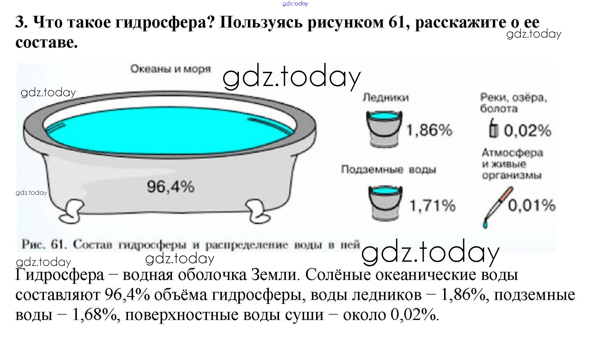 На страницах сайта gdz.today вы найдете учебный и вспомогательный материал, направленный на улучшения знаний школьной программы. ГДЗ - онлайн мир знаний Решение к §28. Состав и строение гидросферы 3 Учебнику по Географии для 5-6 класса Алексеев, Николина Просвещение Полярная звезда 2018