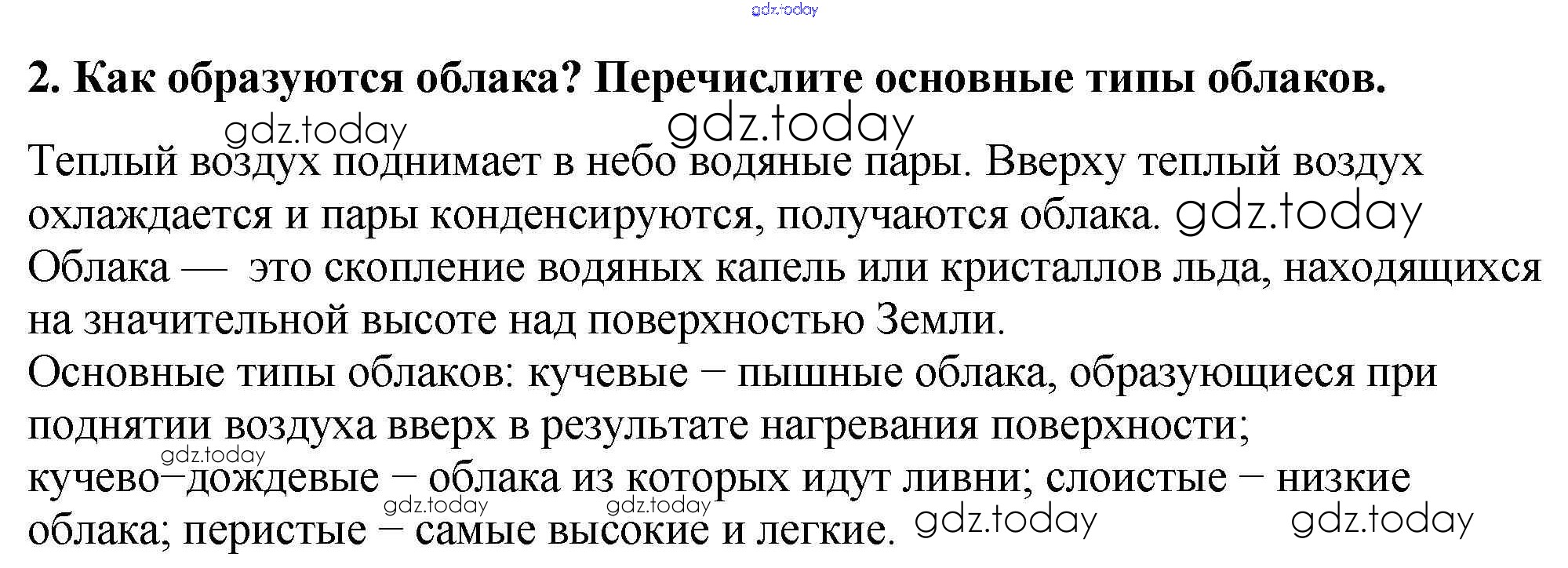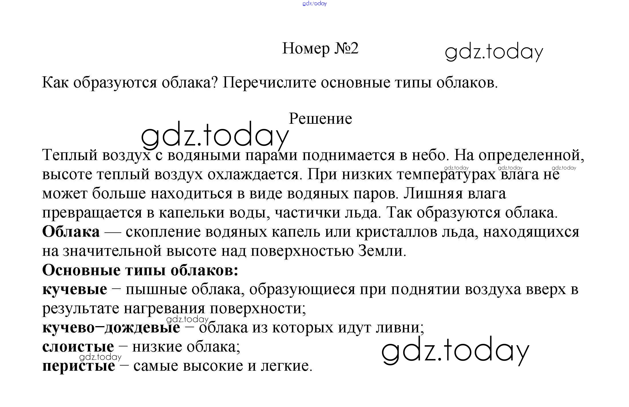 На страницах сайта gdz.today вы найдете учебный и вспомогательный материал, направленный на улучшения знаний школьной программы. ГДЗ - онлайн мир знаний Решение к §44. Влага в атмосфере (2) 2 Учебнику по Географии для 5-6 класса Алексеев, Николина Просвещение Полярная звезда 2018