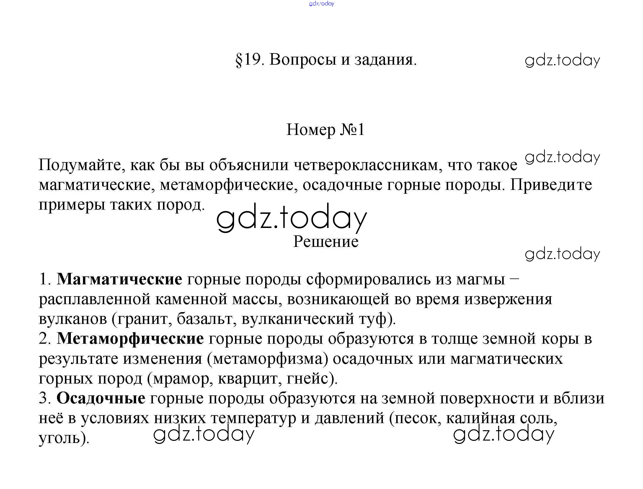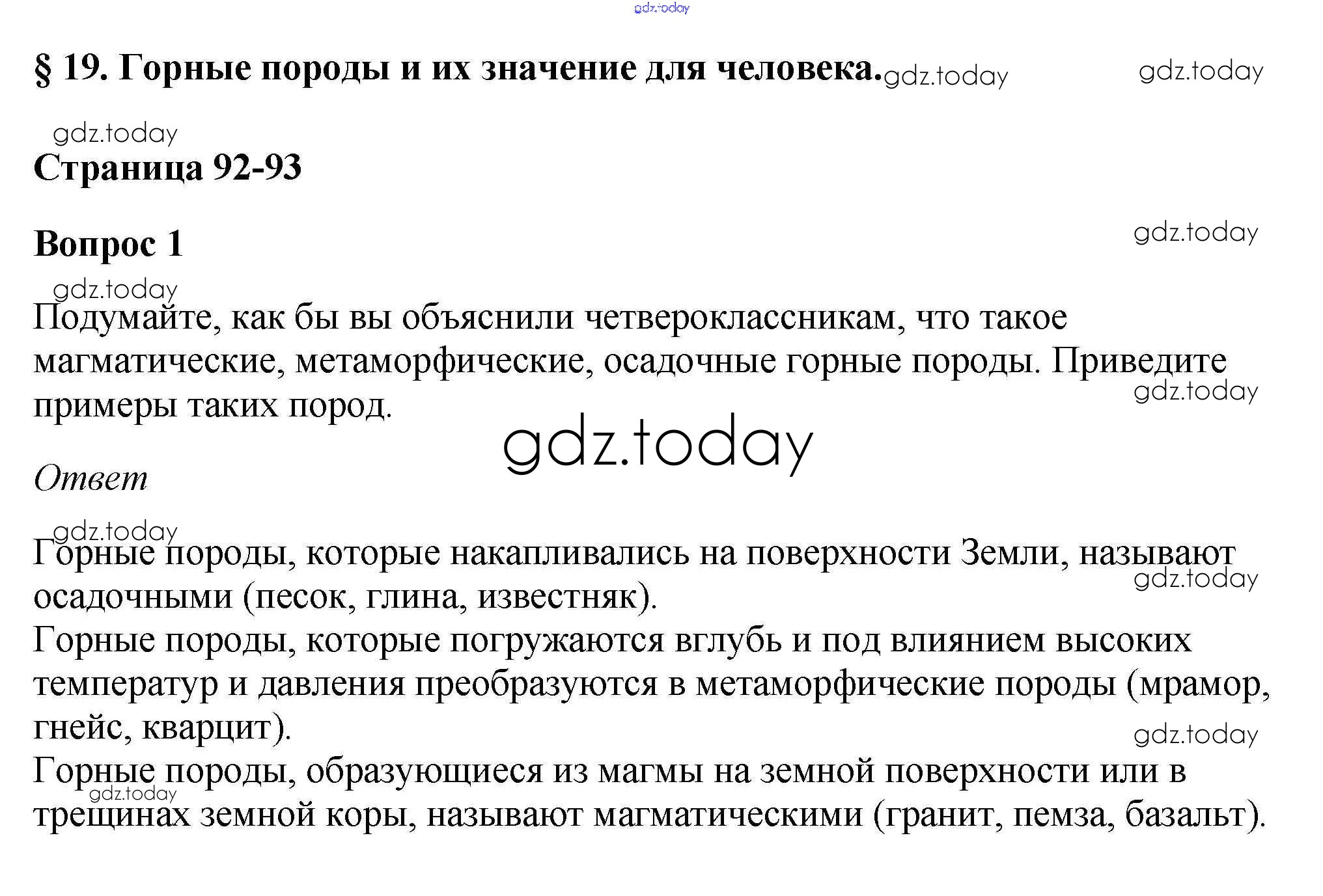 На страницах сайта gdz.today вы найдете учебный и вспомогательный материал, направленный на улучшения знаний школьной программы. ГДЗ - онлайн мир знаний Вопросы и задания §19. Горные породы и их значение для человека 1 Учебнику по Географии для 5-6 класса Климанова, Климанов Дрофа Вертикаль 2017