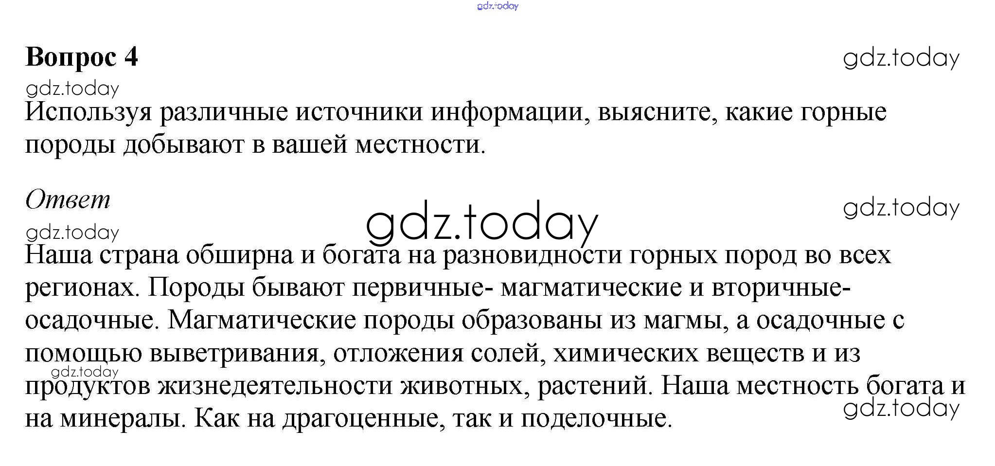 На страницах сайта gdz.today вы найдете учебный и вспомогательный материал, направленный на улучшения знаний школьной программы. ГДЗ - онлайн мир знаний Вопросы и задания §19. Горные породы и их значение для человека 4 Учебнику по Географии для 5-6 класса Климанова, Климанов Дрофа Вертикаль 2017