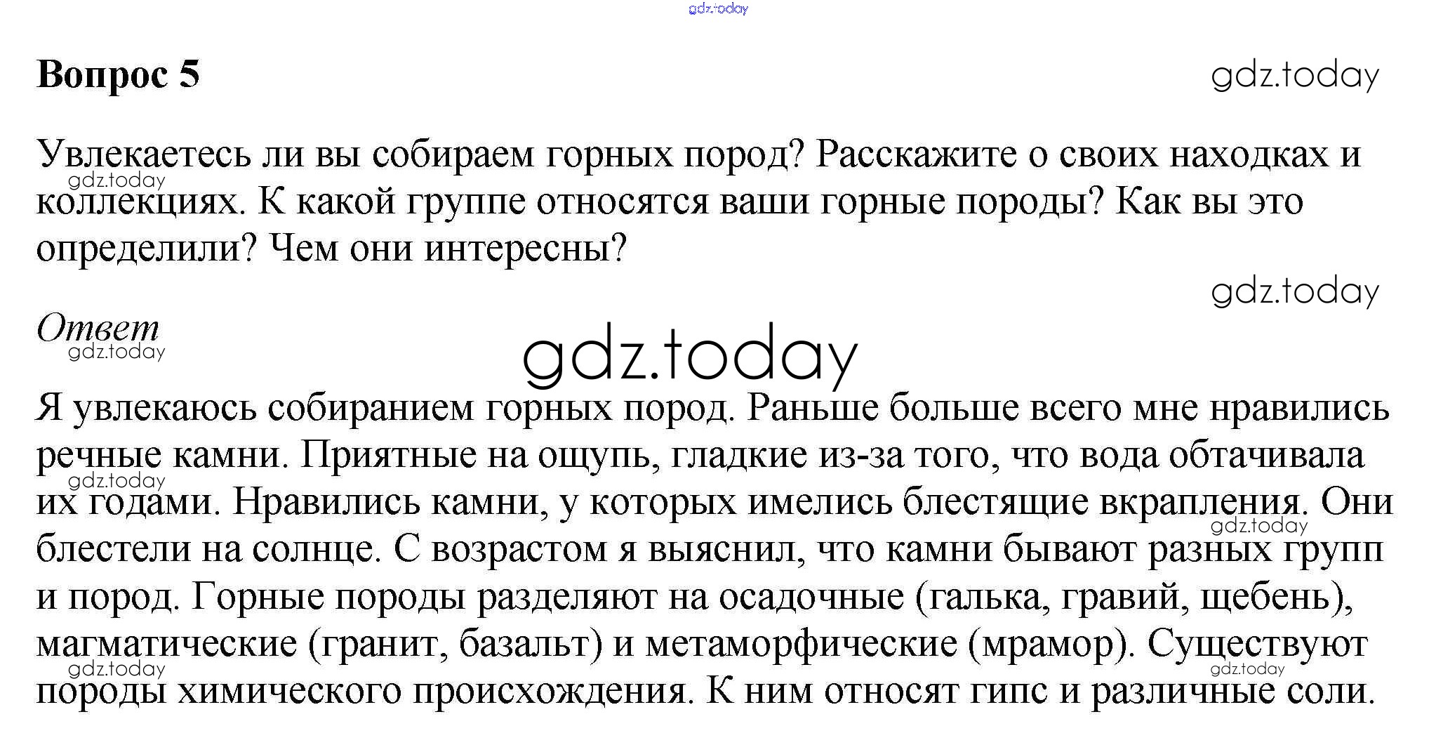 На страницах сайта gdz.today вы найдете учебный и вспомогательный материал, направленный на улучшения знаний школьной программы. ГДЗ - онлайн мир знаний Вопросы и задания §19. Горные породы и их значение для человека 5 Учебнику по Географии для 5-6 класса Климанова, Климанов Дрофа Вертикаль 2017