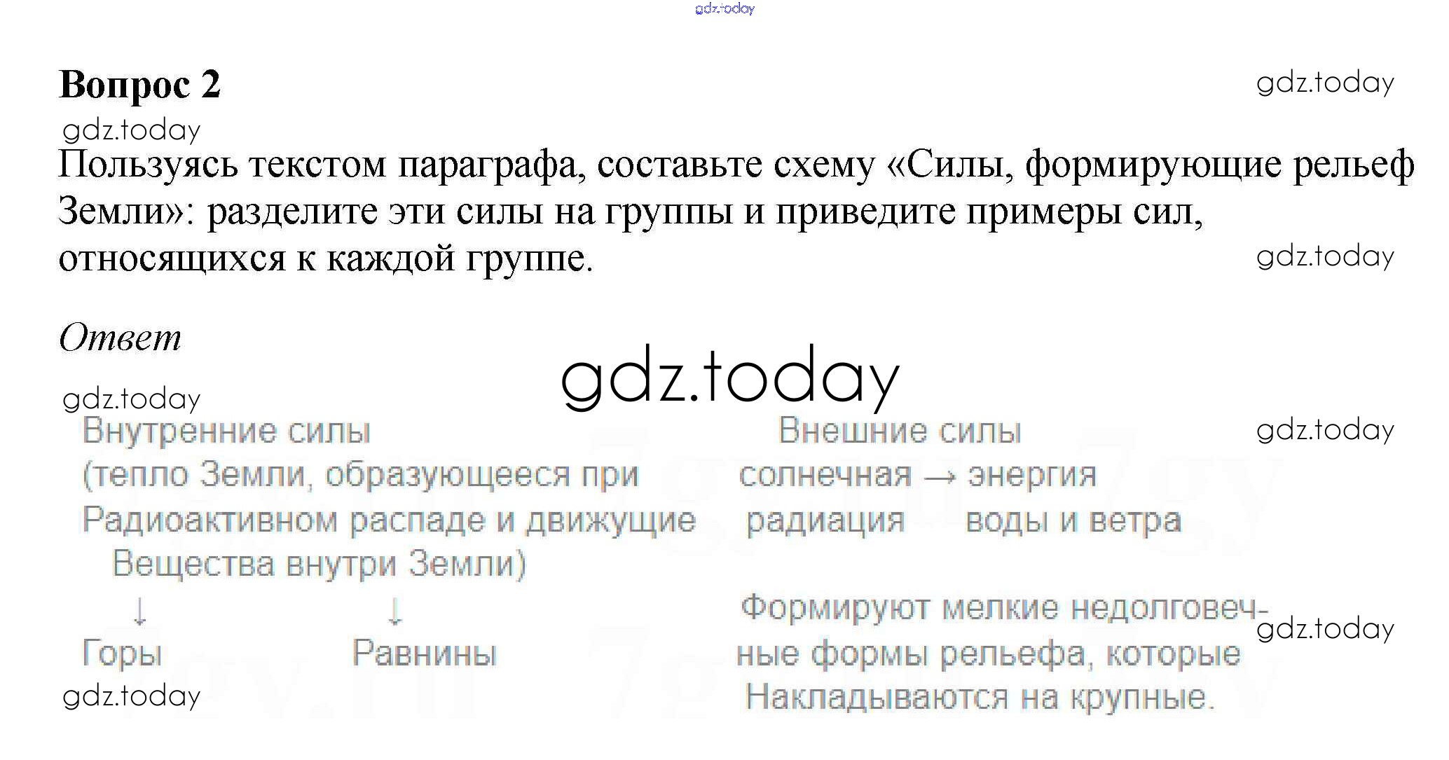 На страницах сайта gdz.today вы найдете учебный и вспомогательный материал, направленный на улучшения знаний школьной программы. ГДЗ - онлайн мир знаний Вопросы и задания §21. Рельеф и его значение для человека 2 Учебнику по Географии для 5-6 класса Климанова, Климанов Дрофа Вертикаль 2017