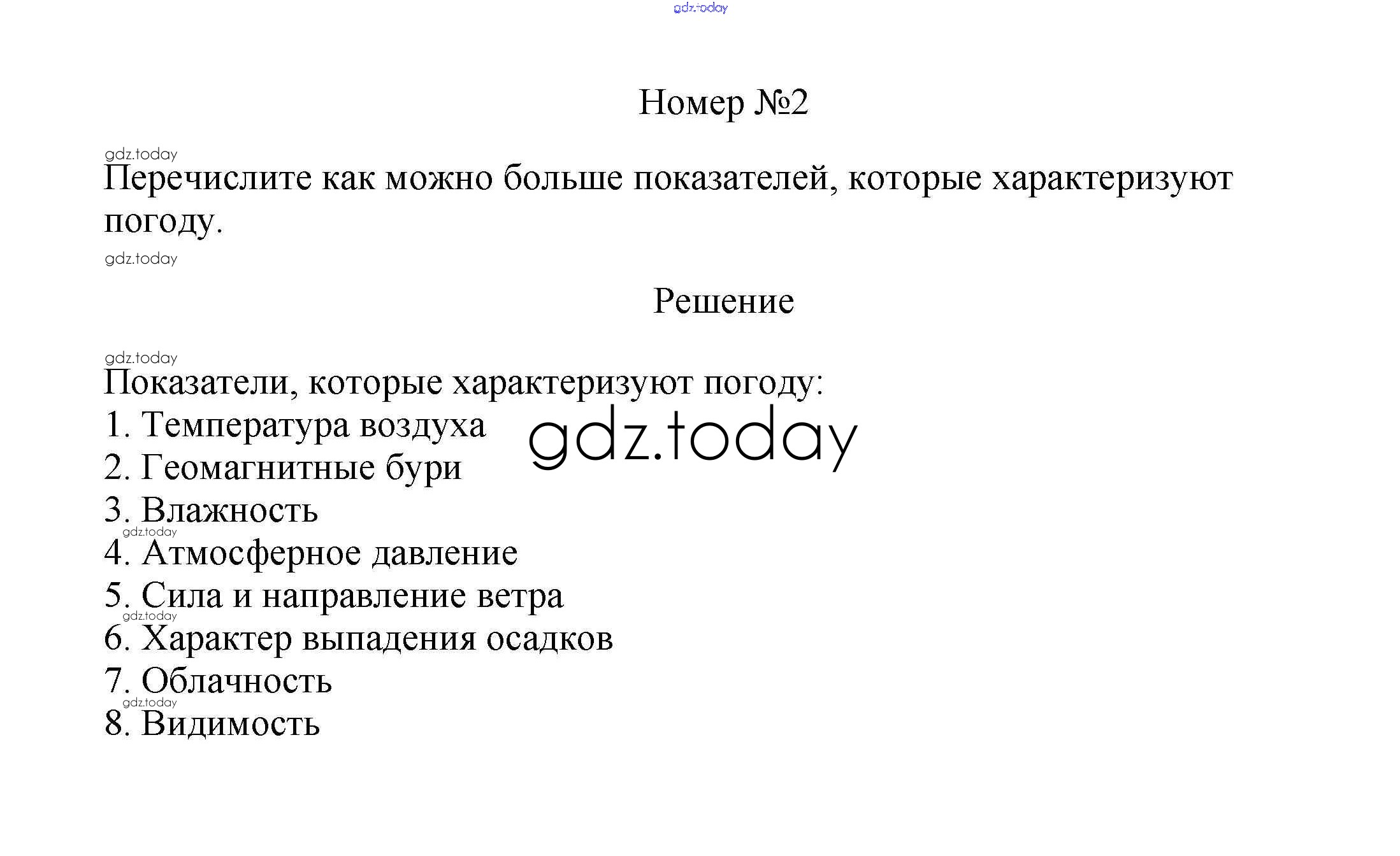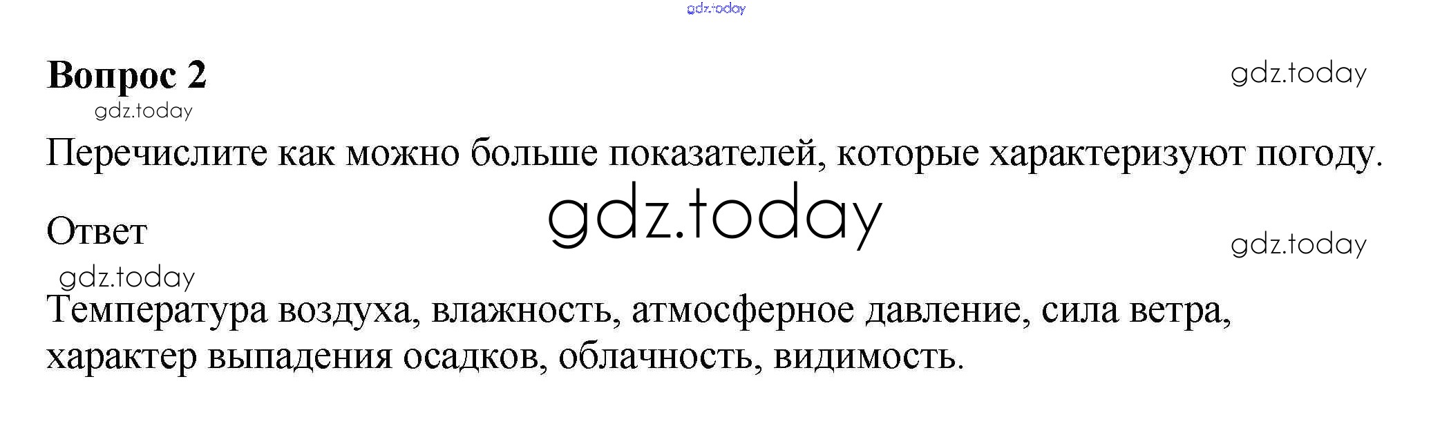 На страницах сайта gdz.today вы найдете учебный и вспомогательный материал, направленный на улучшения знаний школьной программы. ГДЗ - онлайн мир знаний Вопросы и задания §27. Погода 2 Учебнику по Географии для 5-6 класса Климанова, Климанов Дрофа Вертикаль 2017