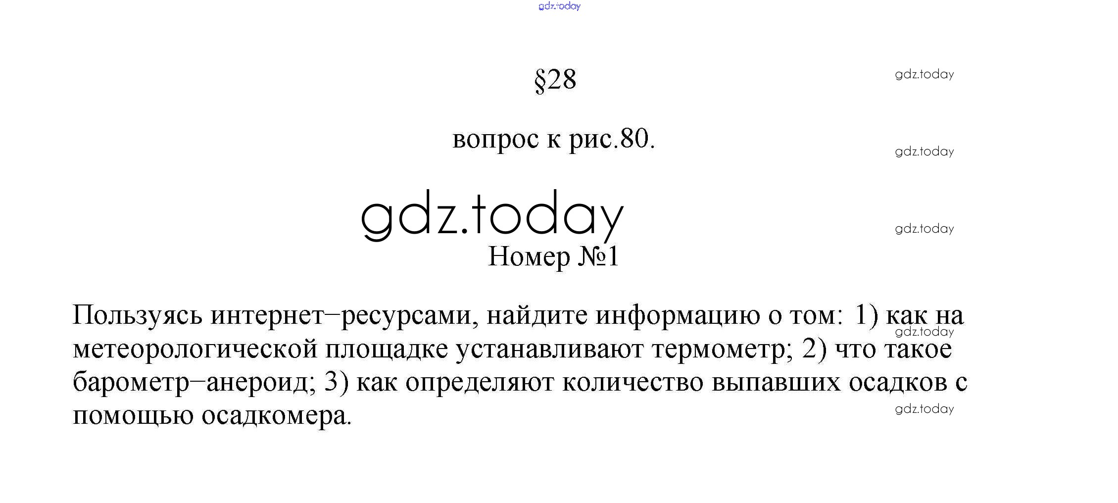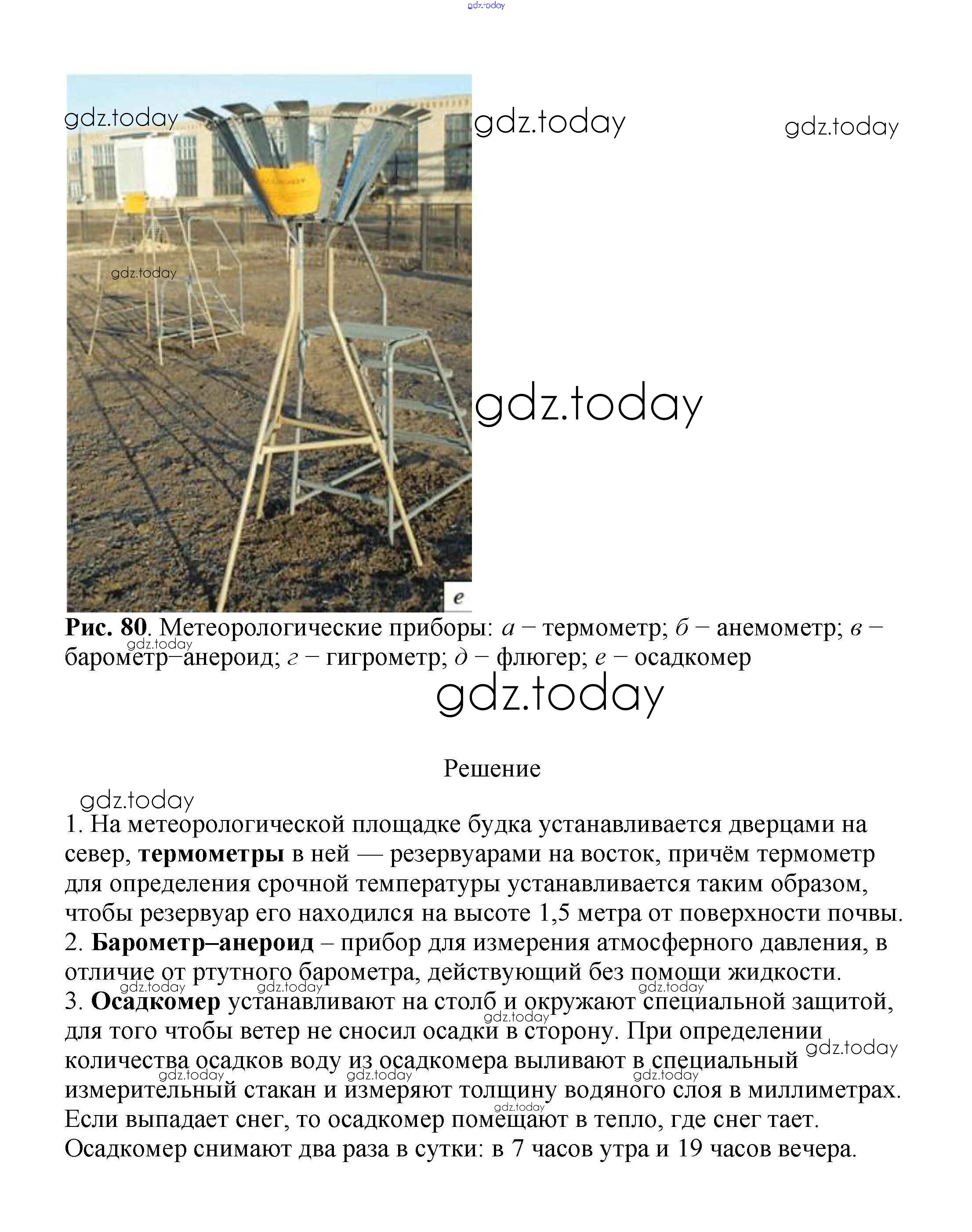 На страницах сайта gdz.today вы найдете учебный и вспомогательный материал, направленный на улучшения знаний школьной программы. ГДЗ - онлайн мир знаний Вопросы к рисункам §28. Урок-практикум. Знакомство с метеорологическими приборами и наблюдение за погодой рис. 80 Учебнику по Географии для 5-6 класса Климанова, Климанов Дрофа Вертикаль 2017