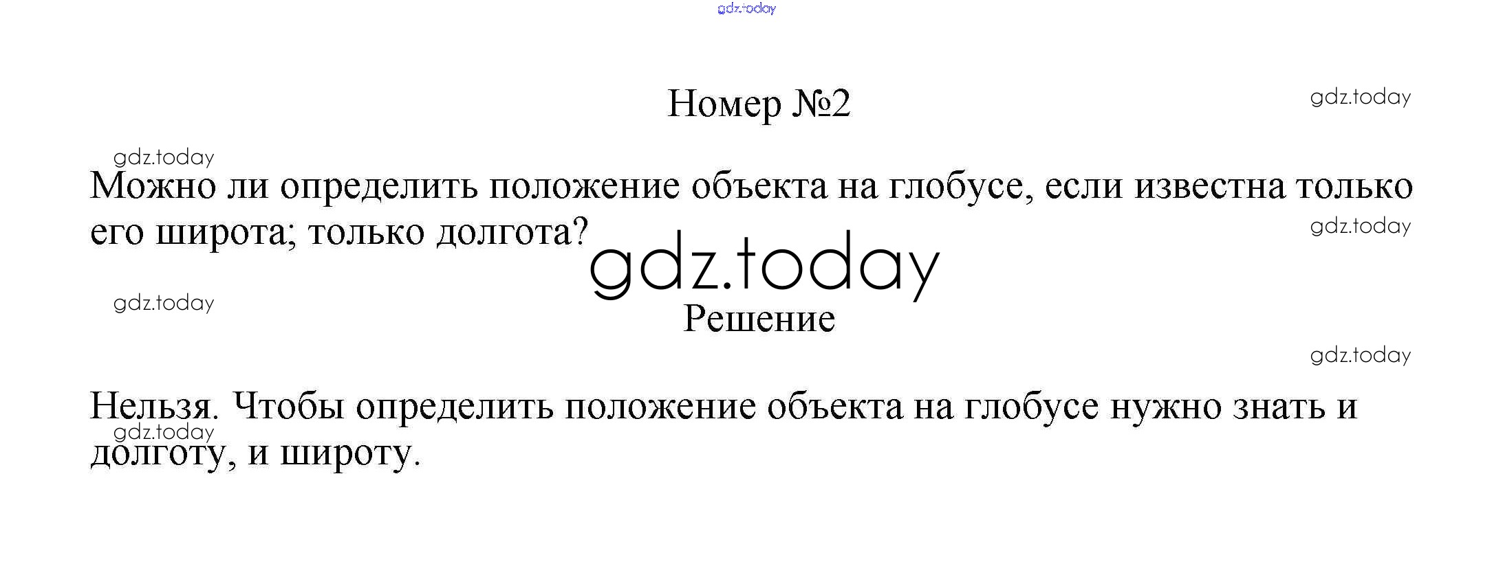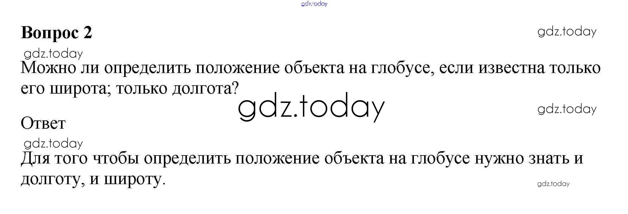 На страницах сайта gdz.today вы найдете учебный и вспомогательный материал, направленный на улучшения знаний школьной программы. ГДЗ - онлайн мир знаний Вопросы и задания §33. Географические координаты 2 Учебнику по Географии для 5-6 класса Климанова, Климанов Дрофа Вертикаль 2017