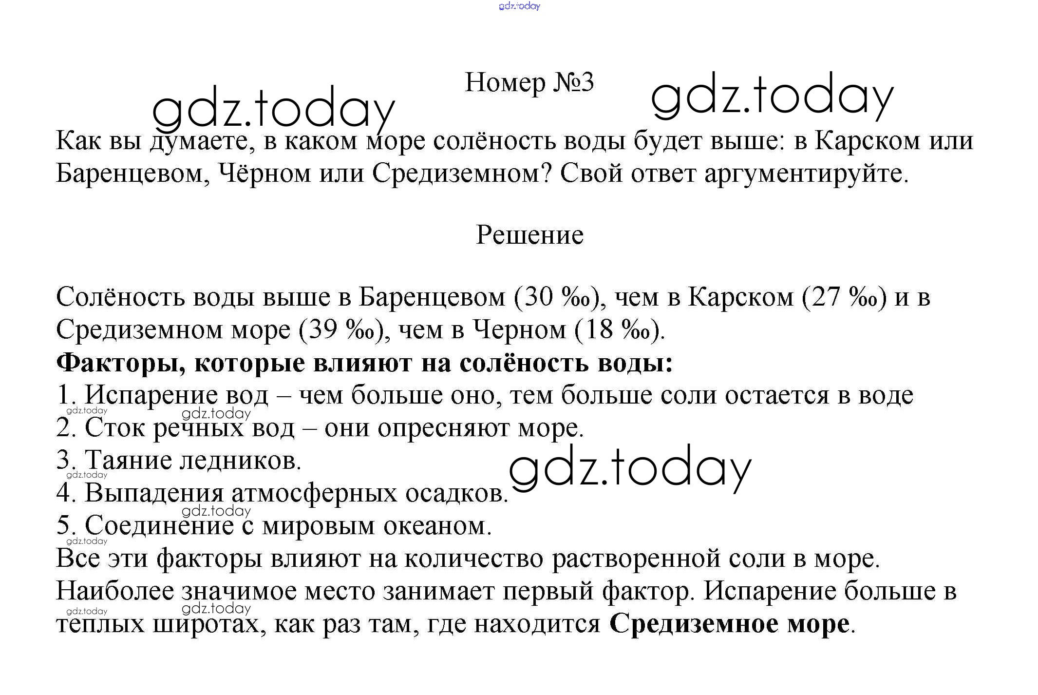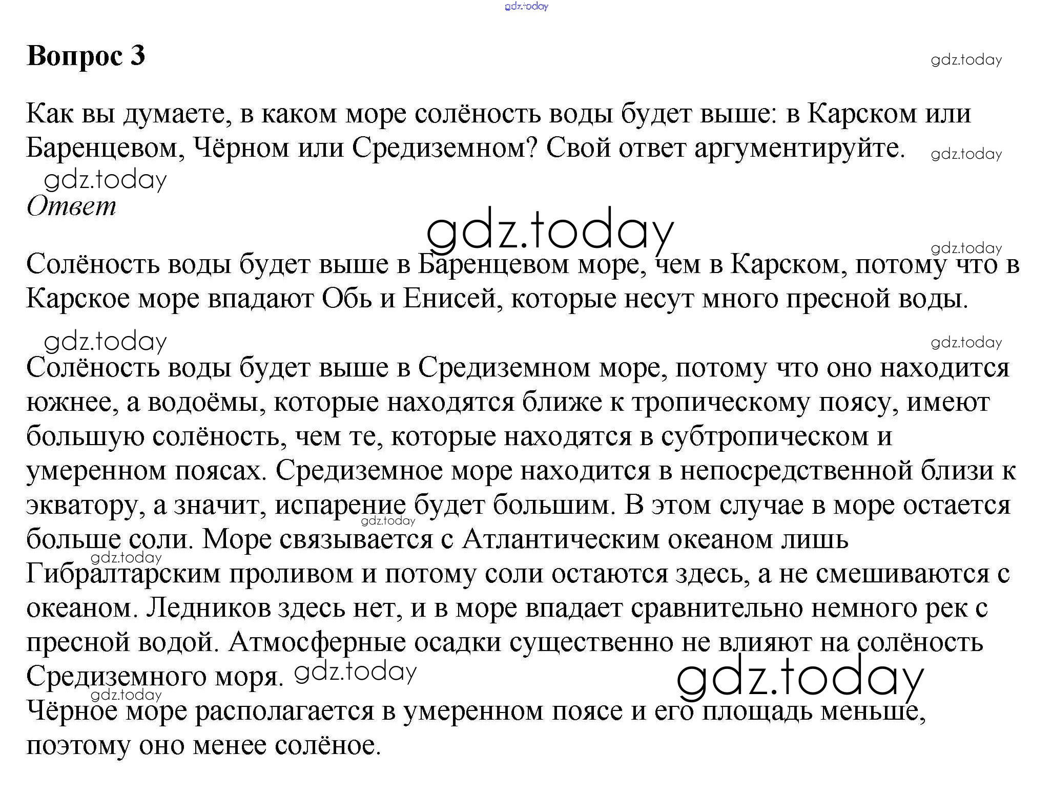 На страницах сайта gdz.today вы найдете учебный и вспомогательный материал, направленный на улучшения знаний школьной программы. ГДЗ - онлайн мир знаний Вопросы и задания §40. Свойства вод Мирового океана 3 Учебнику по Географии для 5-6 класса Климанова, Климанов Дрофа Вертикаль 2017