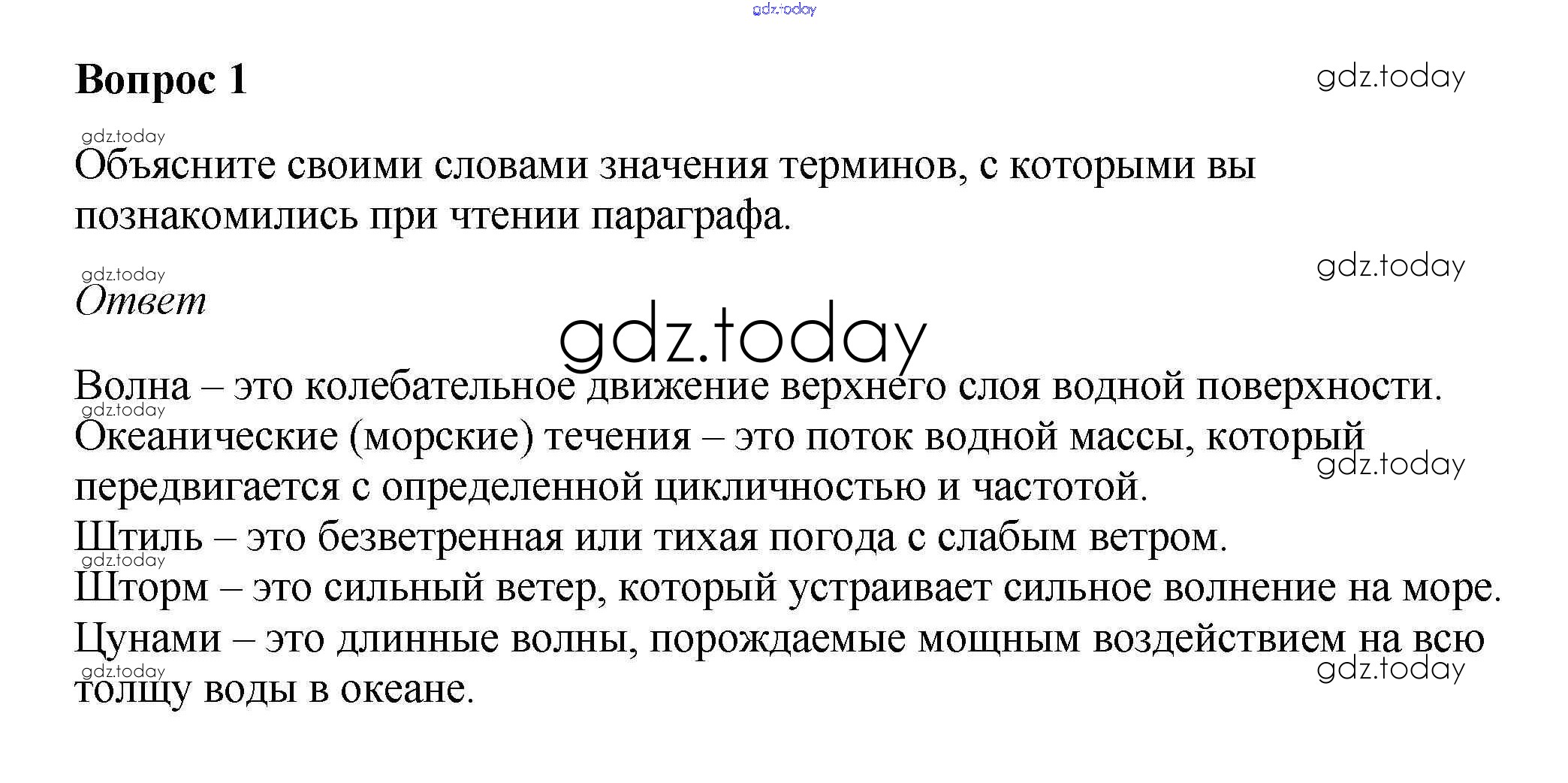 На страницах сайта gdz.today вы найдете учебный и вспомогательный материал, направленный на улучшения знаний школьной программы. ГДЗ - онлайн мир знаний Вопросы и задания §41. Движение вод в Мировом океане 1 Учебнику по Географии для 5-6 класса Климанова, Климанов Дрофа Вертикаль 2017