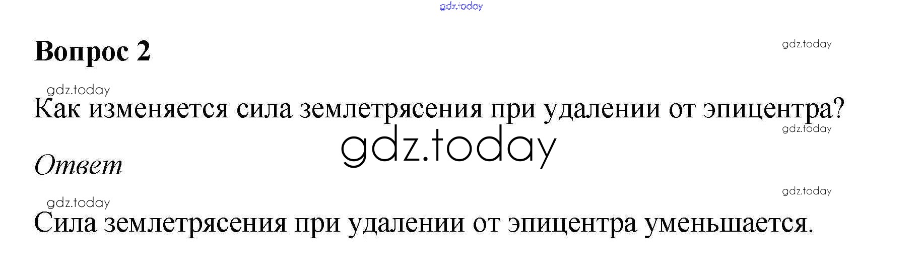 На страницах сайта gdz.today вы найдете учебный и вспомогательный материал, направленный на улучшения знаний школьной программы. ГДЗ - онлайн мир знаний Вопросы и задания §43. Землетрясения: причины и последствия 2 Учебнику по Географии для 5-6 класса Климанова, Климанов Дрофа Вертикаль 2017