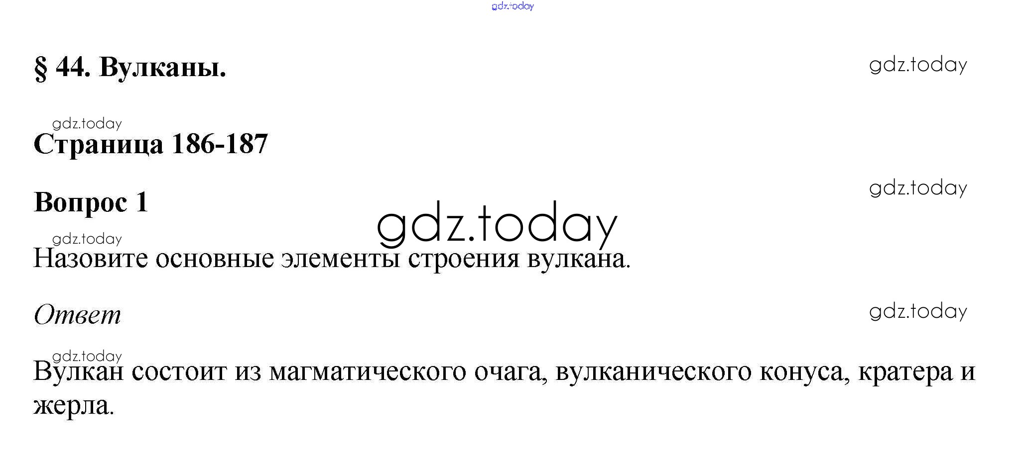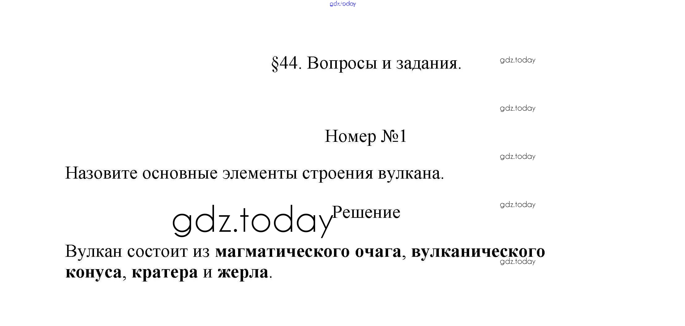 На страницах сайта gdz.today вы найдете учебный и вспомогательный материал, направленный на улучшения знаний школьной программы. ГДЗ - онлайн мир знаний Вопросы и задания §44. Вулканы 1 Учебнику по Географии для 5-6 класса Климанова, Климанов Дрофа Вертикаль 2017