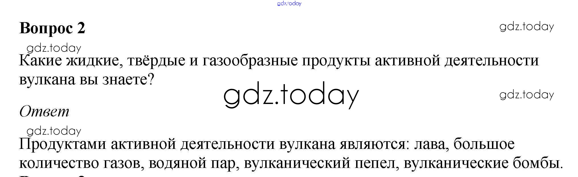 На страницах сайта gdz.today вы найдете учебный и вспомогательный материал, направленный на улучшения знаний школьной программы. ГДЗ - онлайн мир знаний Вопросы и задания §44. Вулканы 2 Учебнику по Географии для 5-6 класса Климанова, Климанов Дрофа Вертикаль 2017