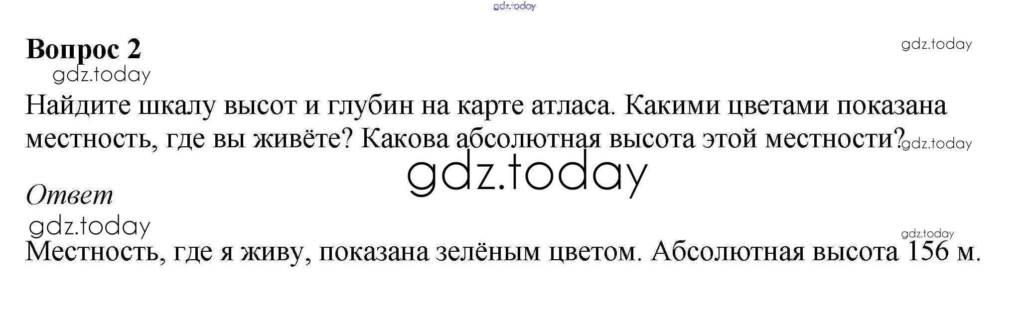 На страницах сайта gdz.today вы найдете учебный и вспомогательный материал, направленный на улучшения знаний школьной программы. ГДЗ - онлайн мир знаний Вопросы и задания §45. Изображение рельефа на планах местности и географических картах 2 Учебнику по Географии для 5-6 класса Климанова, Климанов Дрофа Вертикаль 2017