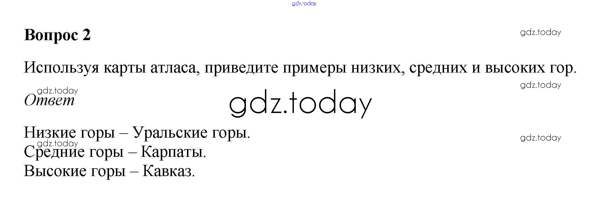 На страницах сайта gdz.today вы найдете учебный и вспомогательный материал, направленный на улучшения знаний школьной программы. ГДЗ - онлайн мир знаний Вопросы и задания §46. Горы 2 Учебнику по Географии для 5-6 класса Климанова, Климанов Дрофа Вертикаль 2017