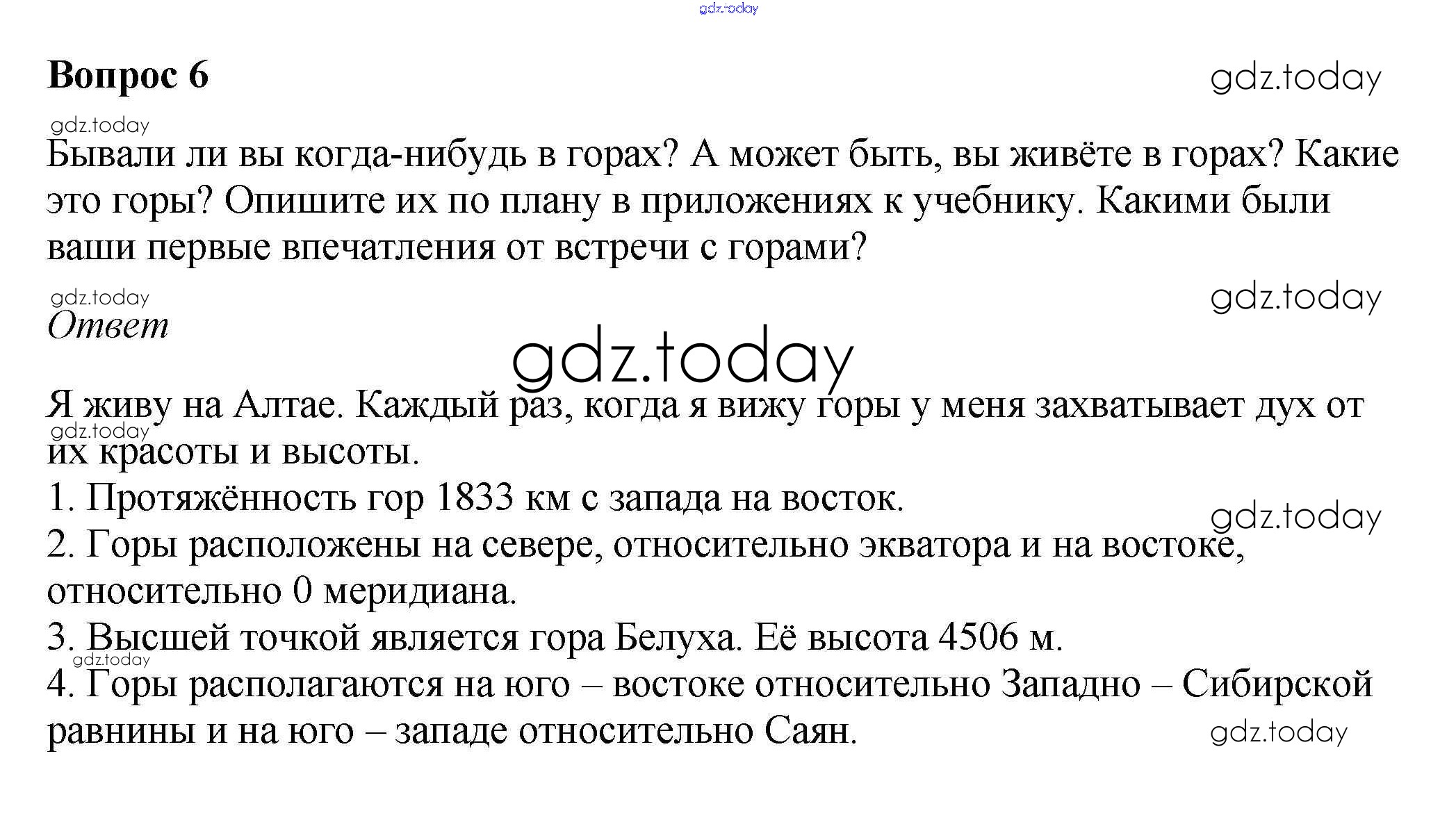 На страницах сайта gdz.today вы найдете учебный и вспомогательный материал, направленный на улучшения знаний школьной программы. ГДЗ - онлайн мир знаний Вопросы и задания §46. Горы 6 Учебнику по Географии для 5-6 класса Климанова, Климанов Дрофа Вертикаль 2017
