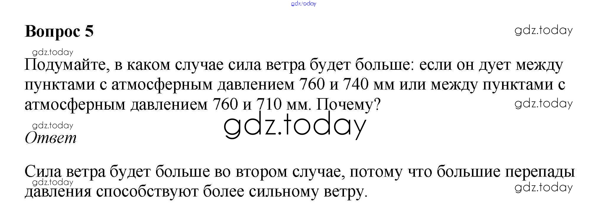 На страницах сайта gdz.today вы найдете учебный и вспомогательный материал, направленный на улучшения знаний школьной программы. ГДЗ - онлайн мир знаний Вопросы и задания §49. Атмосферное давление. Ветер 5 Учебнику по Географии для 5-6 класса Климанова, Климанов Дрофа Вертикаль 2017