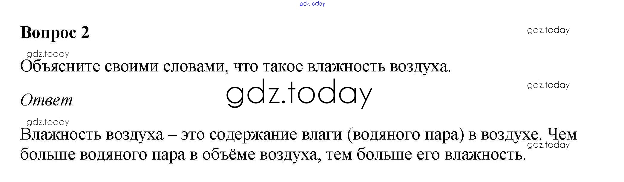 На страницах сайта gdz.today вы найдете учебный и вспомогательный материал, направленный на улучшения знаний школьной программы. ГДЗ - онлайн мир знаний Вопросы и задания §50. Облака и атмосферные осадки 2 Учебнику по Географии для 5-6 класса Климанова, Климанов Дрофа Вертикаль 2017