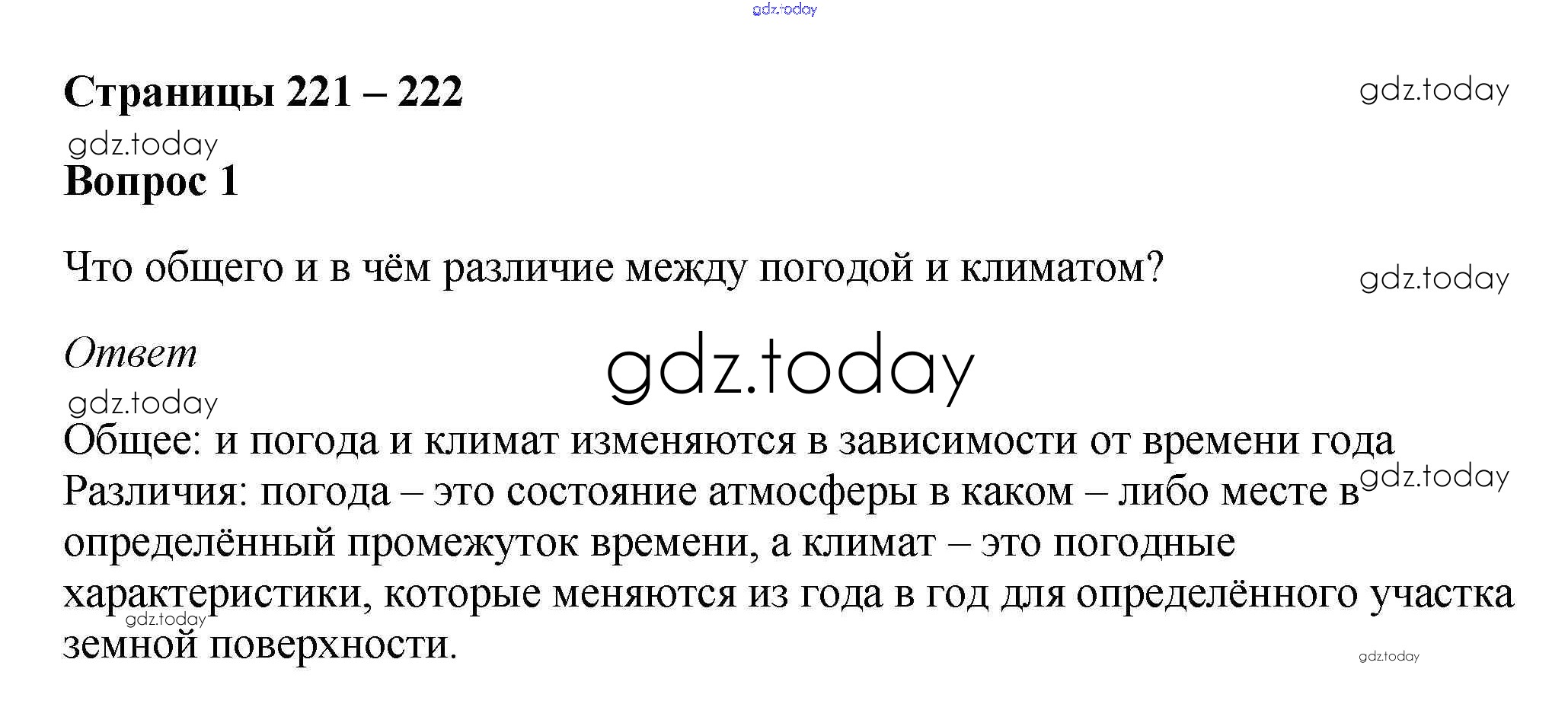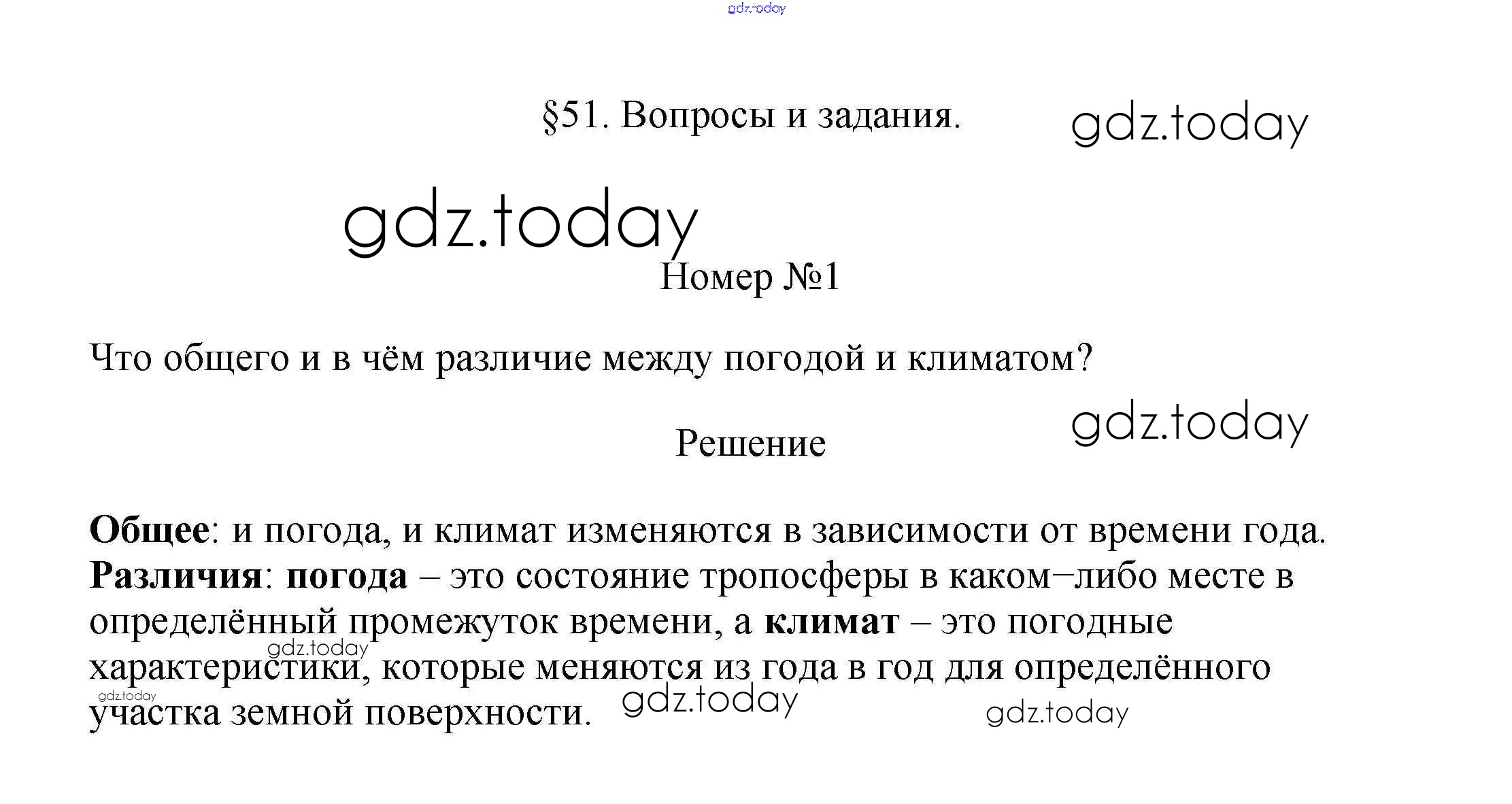 На страницах сайта gdz.today вы найдете учебный и вспомогательный материал, направленный на улучшения знаний школьной программы. ГДЗ - онлайн мир знаний Вопросы и задания §51. Погода и климат 1 Учебнику по Географии для 5-6 класса Климанова, Климанов Дрофа Вертикаль 2017