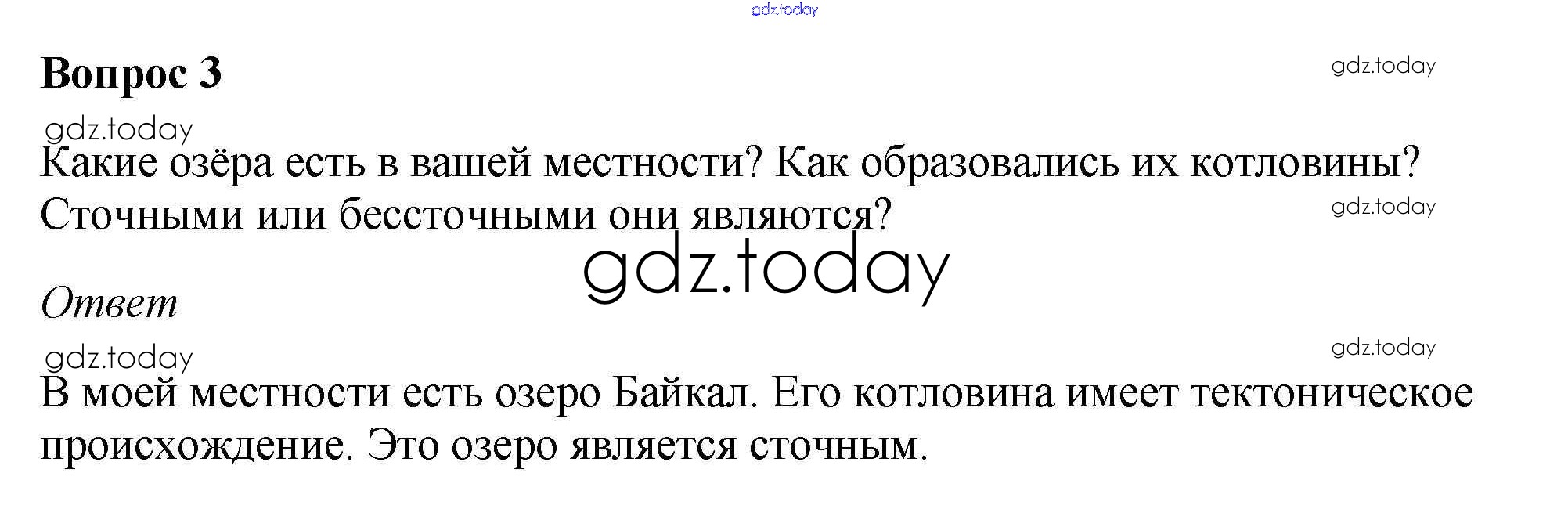 На страницах сайта gdz.today вы найдете учебный и вспомогательный материал, направленный на улучшения знаний школьной программы. ГДЗ - онлайн мир знаний Вопросы и задания §55. Озёра 3 Учебнику по Географии для 5-6 класса Климанова, Климанов Дрофа Вертикаль 2017