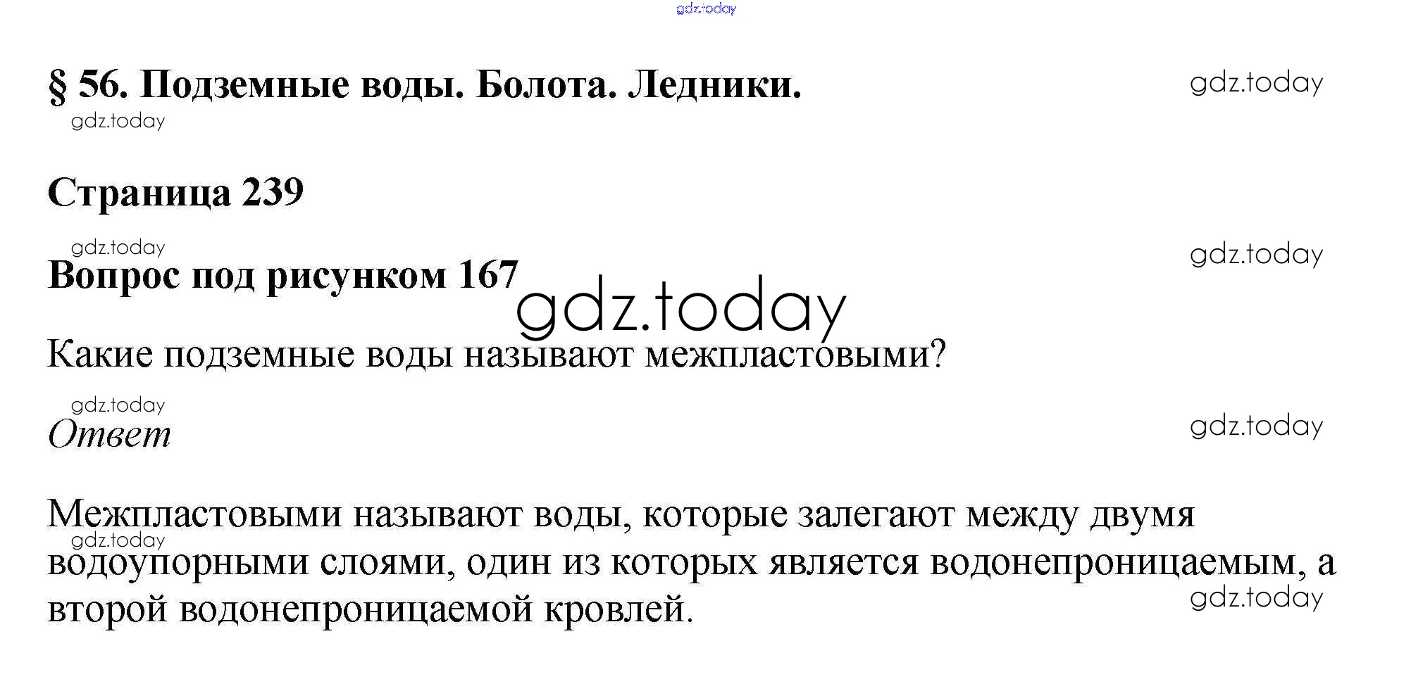 На страницах сайта gdz.today вы найдете учебный и вспомогательный материал, направленный на улучшения знаний школьной программы. ГДЗ - онлайн мир знаний Вопросы к рисункам §56. Подземные воды. Болота. Ледники рис. 167 Учебнику по Географии для 5-6 класса Климанова, Климанов Дрофа Вертикаль 2017